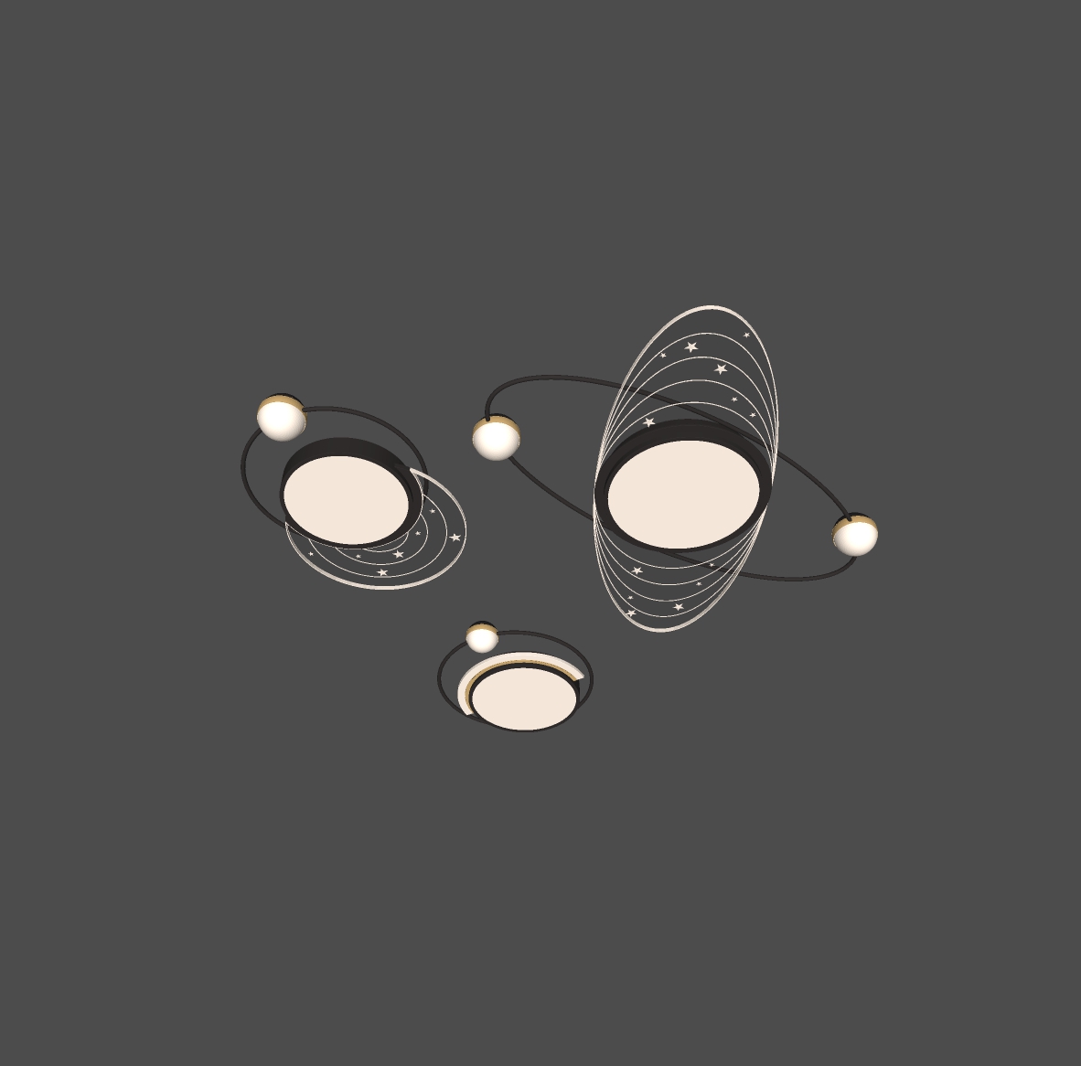 Hình ảnh trên thể hiện một mẫu đèn trần độc đáo với thiết kế lấy cảm hứng từ hệ hành tinh. Đèn gồm ba vòng sáng chính, mỗi vòng được bao bọc bởi cấu trúc hình cầu mỏng, có các vòng tròn đồng tâm và được nhấn nhá bởi các chi tiết nhỏ mô phỏng hình dáng ngôi sao, tạo hiệu ứng như một hệ mặt trời thu nhỏ.