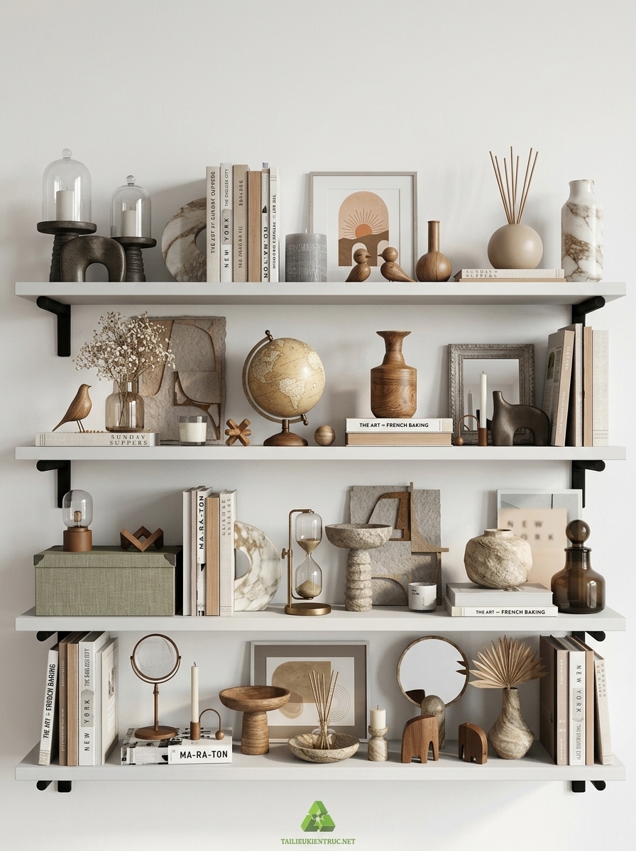 Trong những hình ảnh này, chúng ta thấy một bộ sưu tập kệ trang trí được bố trí tinh tế và cân đối. Mỗi kệ được trang bị nhiều vật dụng trang trí khác nhau như sách, hình ảnh, chậu cây nhỏ và các loại đồ gốm, tạo nên một cảm giác ấm cúng và thân thiện.