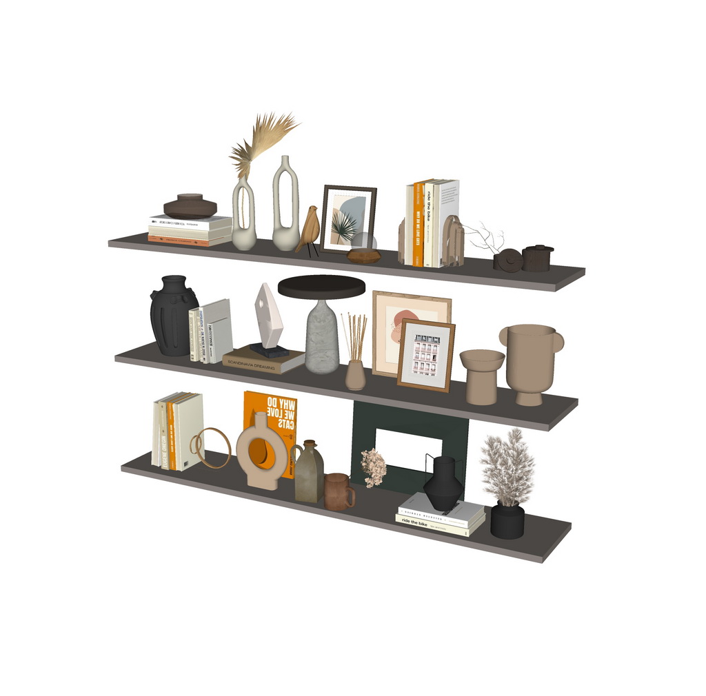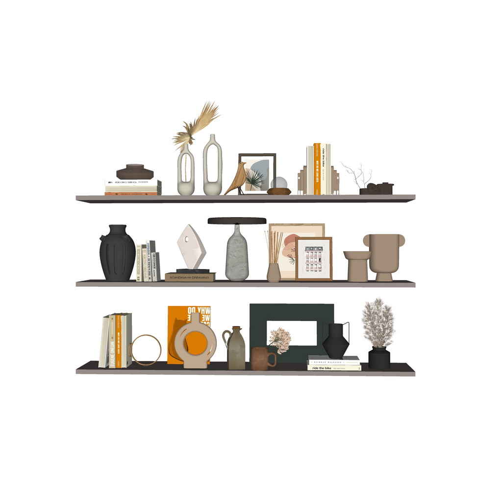Các chi tiết trưng bày trên kệ bao gồm các loại bình gốm, sách, khung ảnh và các vật trang trí khác. Sự đa dạng về hình dáng và kích thước của các vật phẩm này tạo nên một bố cục hài hòa và bắt mắt.