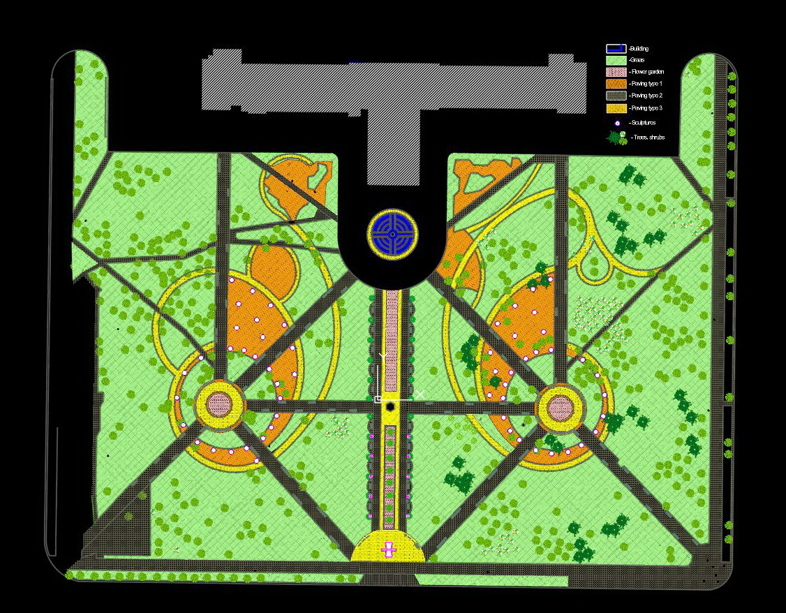 Hình ảnh này thể hiện quá trình quy hoạch chi tiết các vùng: từ không gian cây xanh, khu vườn hoa, tới các loại vật liệu lát nền như gạch và xi măng. Bên cạnh đó, công viên còn được trang bị nhiều bức tượng điêu khắc, tạo điểm nhấn và làm phong phú thêm cảnh quan.