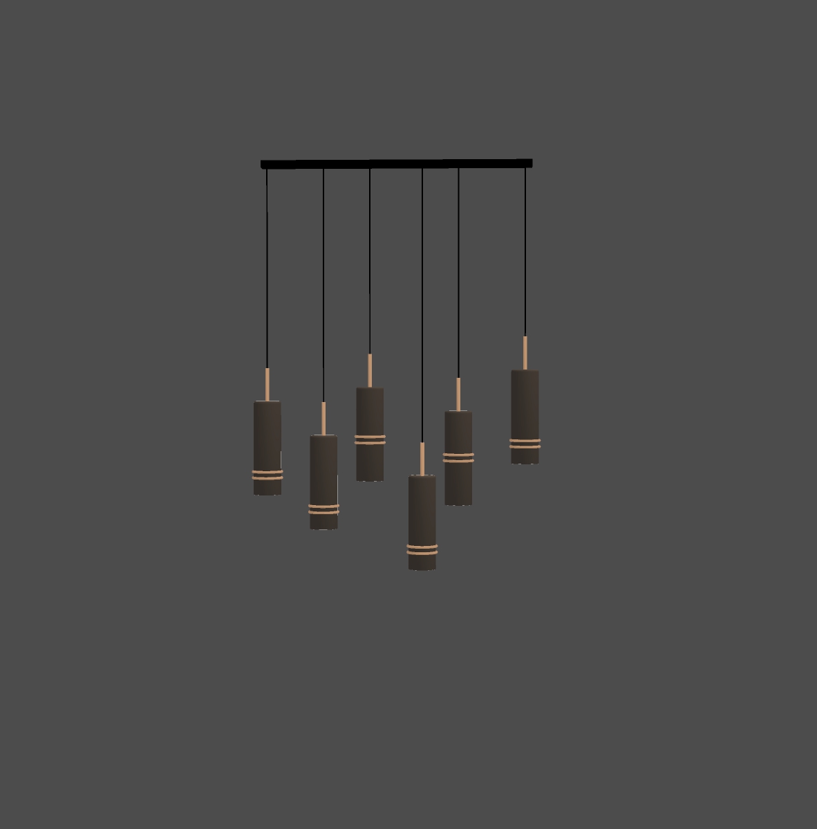 Bộ đèn này gồm bảy đèn treo kết hợp với nhau tạo nên một không gian chiếu sáng ấm áp và sang trọng. Các đèn được thiết kế theo hình dáng ống trụ dài, tạo điểm nhấn thẩm mỹ đặc sắc cho mọi không gian từ phòng khách đến quầy bar.