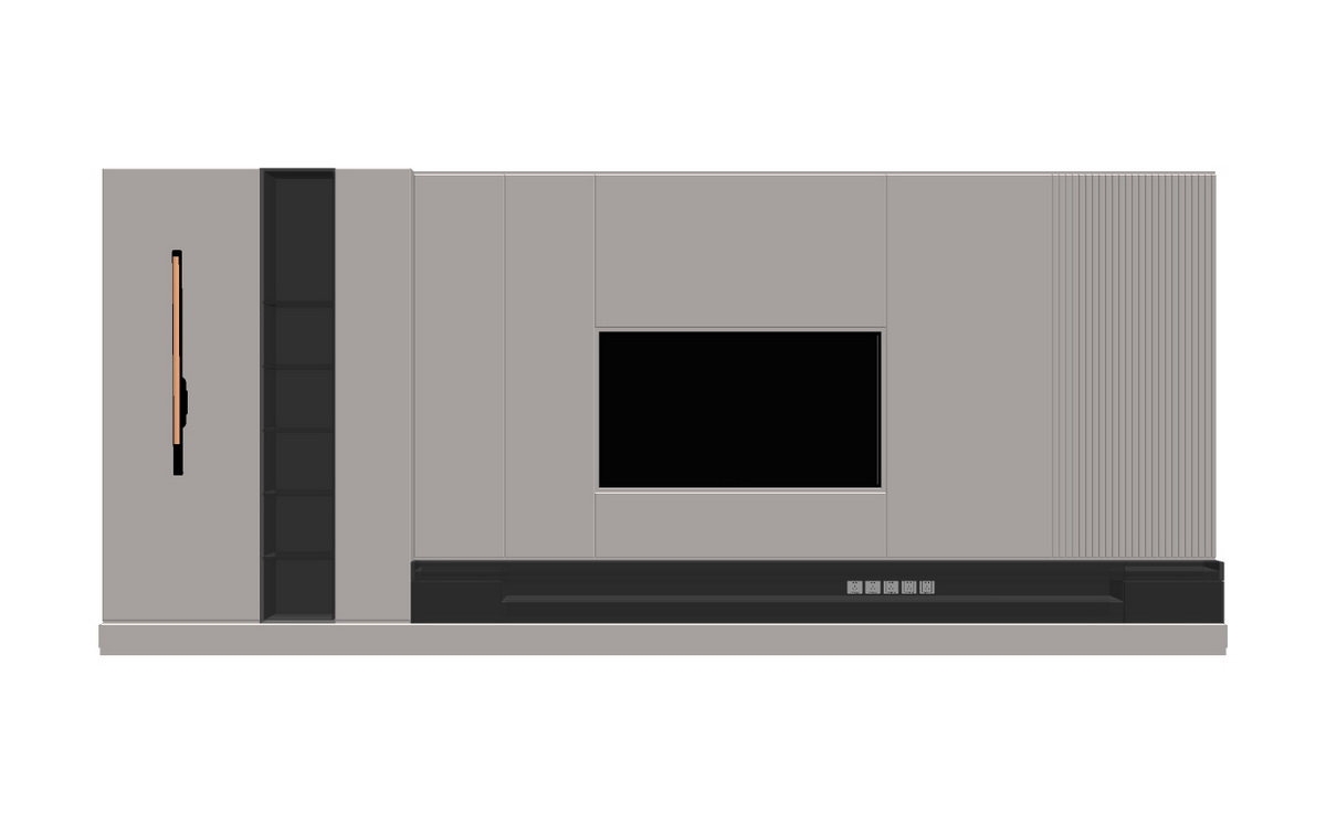 Thiết kế tủ kệ này gồm hai phần chính với màu sắc chủ đạo là ghi xám, mang lại vẻ đẹp thanh lịch và hiện đại cho căn phòng. Phần bên trái của tủ được thiết kế với các khoang chứa đồ, tạo không gian lưu trữ tiện lợi. Phần giữa là nơi đặt TV, được bố trí sao cho hợp lý, cân đối. Các đường nét của tủ rất hài hòa, cùng với các ngăn mở và đóng linh hoạt, giúp dễ dàng lưu trữ và sắp xếp đồ đạc.