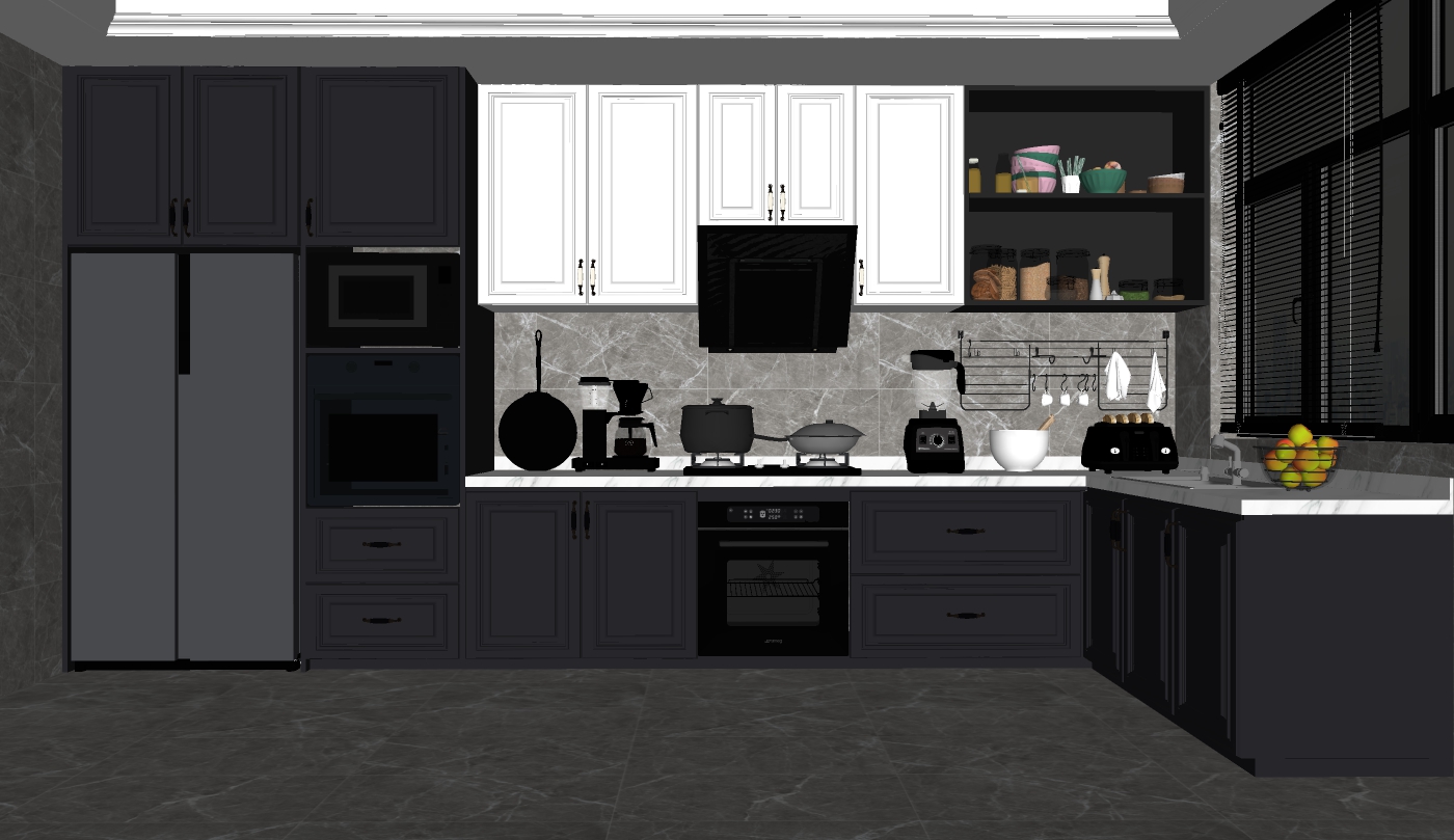 Trong các hình ảnh trên, chúng ta có thể thấy một căn bếp được thiết kế theo phong cách châu Âu sang trọng với sự kết hợp giữa các tông màu đen, trắng và xám nhạt. Tủ bếp trên và dưới được làm bằng vật liệu cao cấp, tạo cảm giác chắc chắn và bền bỉ.