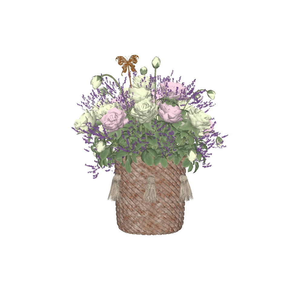 Hình ảnh thứ hai là một mô hình 3D của cùng giỏ hoa, cho thấy sự chính xác và chi tiết trong thiết kế, phù hợp cho việc tham khảo và sử dụng trong các phần mềm thiết kế kiến trúc và nội thất.