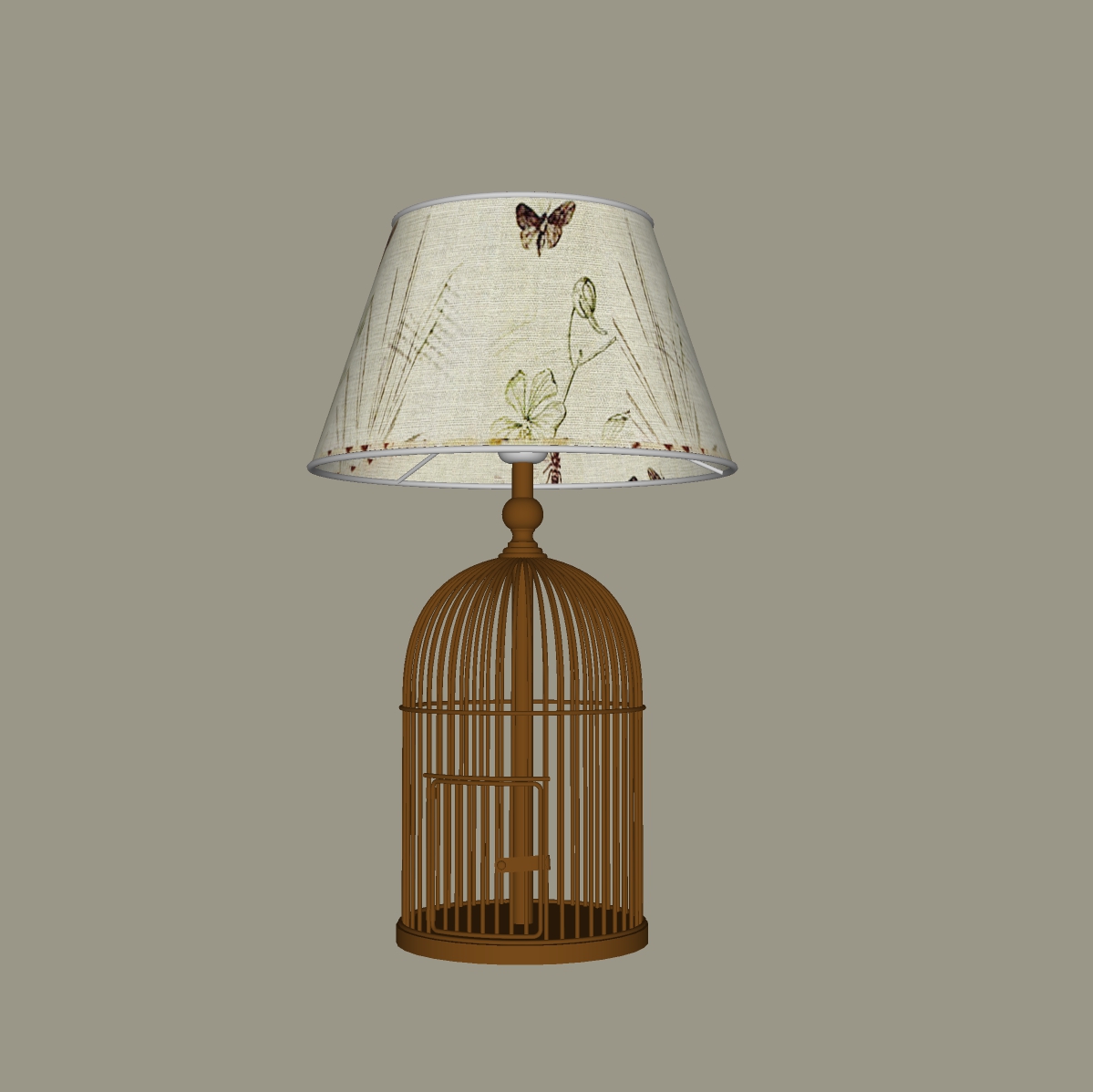 Đèn bàn này có thiết kế đặc biệt với phần chân đèn được tạo hình như một chiếc lồng chim màu nâu. Điều này không chỉ mang lại cảm giác cổ điển mà còn tạo điểm nhấn cho không gian. Chụp đèn được trang trí bằng vải với họa tiết thiên nhiên, bao gồm hình ảnh những cánh bướm và lá cây, tạo cảm giác nhẹ nhàng, thư thái.