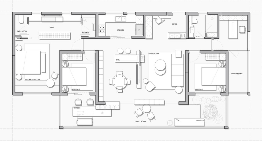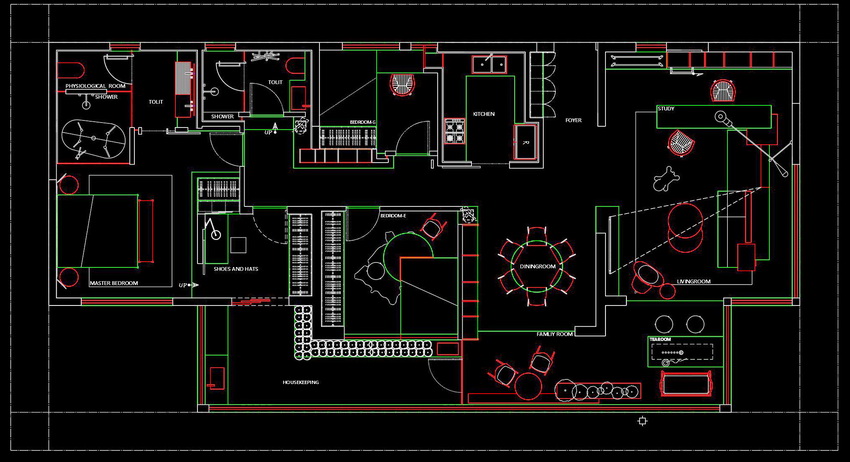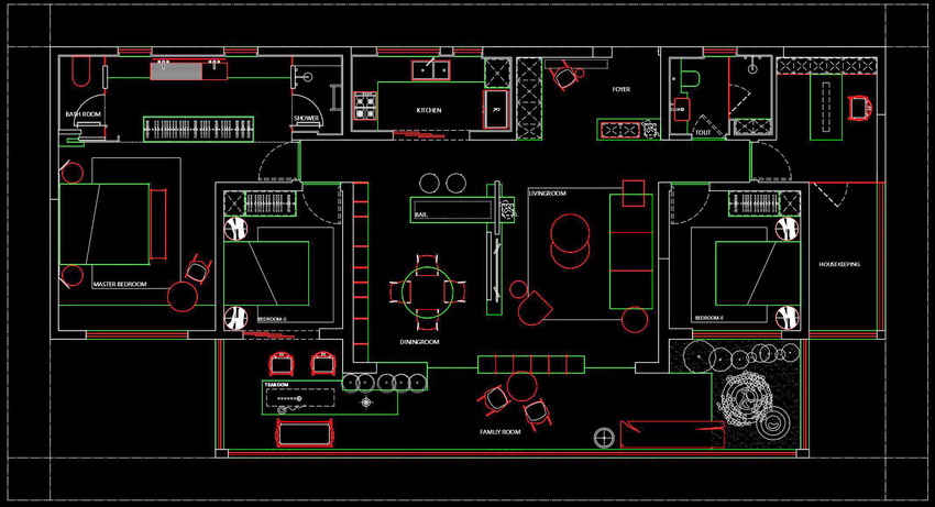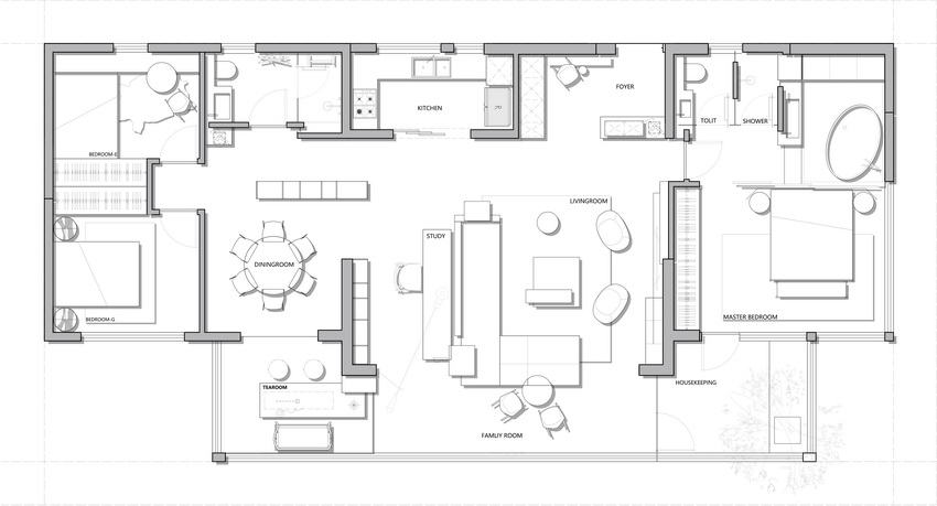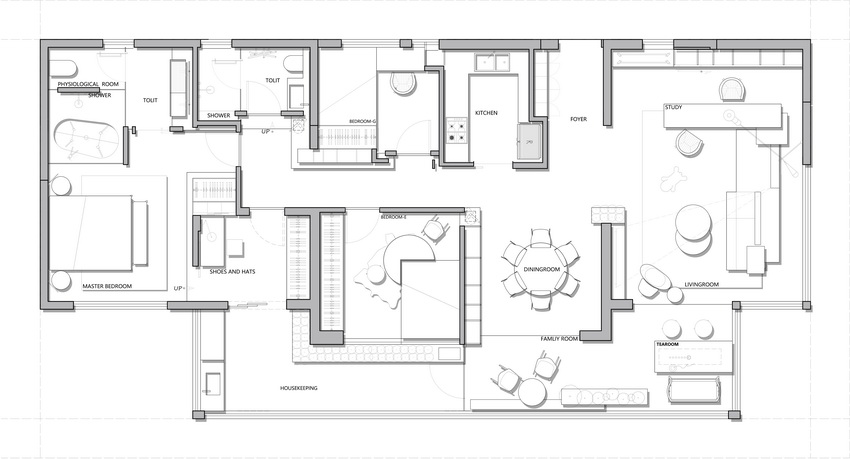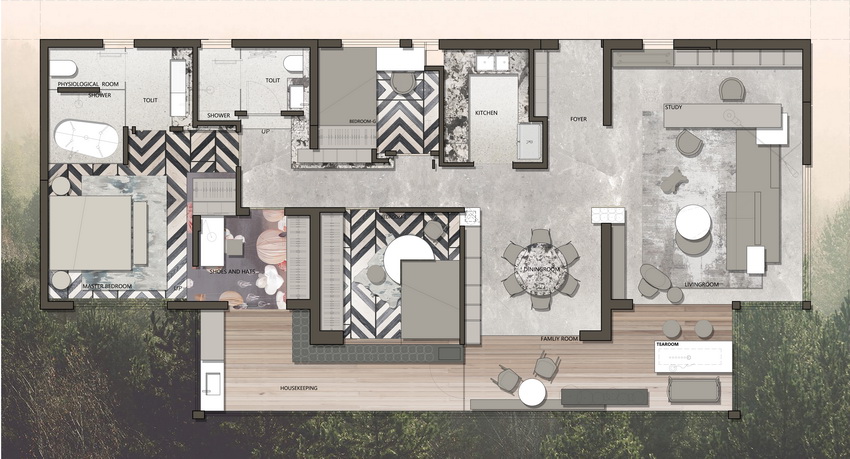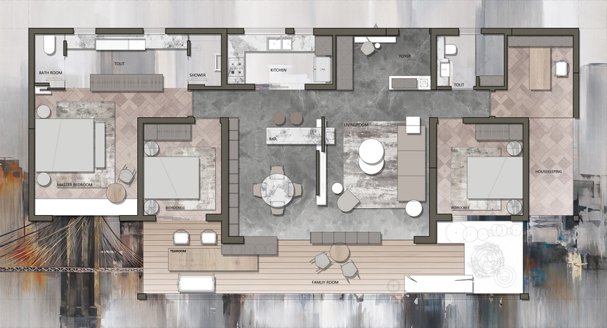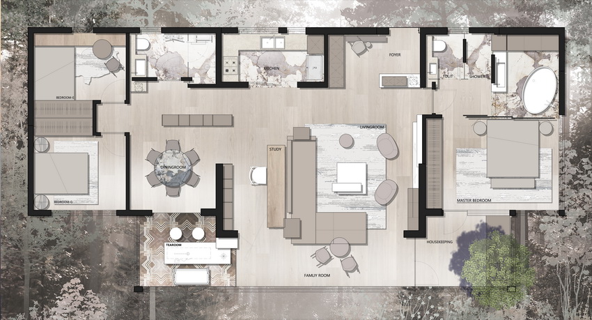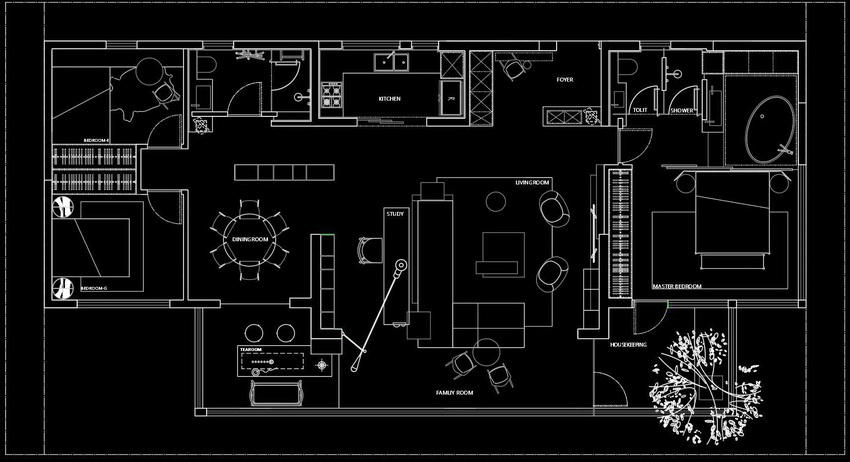 Bản vẽ tổng quan cho thấy sự phân chia thông minh của các không gian phòng ngủ, phòng khách, phòng tắm và bếp. Phòng khách rộng rãi được bố trí với sofa lớn, bàn trà, kết nối với khu vực ăn uống và nhà bếp mở, tạo không gian sinh hoạt chung thoải mái. Phòng ngủ chính được thiết kế với giường lớn, phòng tắm riêng biệt, đảm bảo sự riêng tư và tiện nghi. Những chi tiết như khu vực học tập, phòng gia đình đều được đặt trong những vị trí chiến lược, thuận tiện cho việc sử dụng.