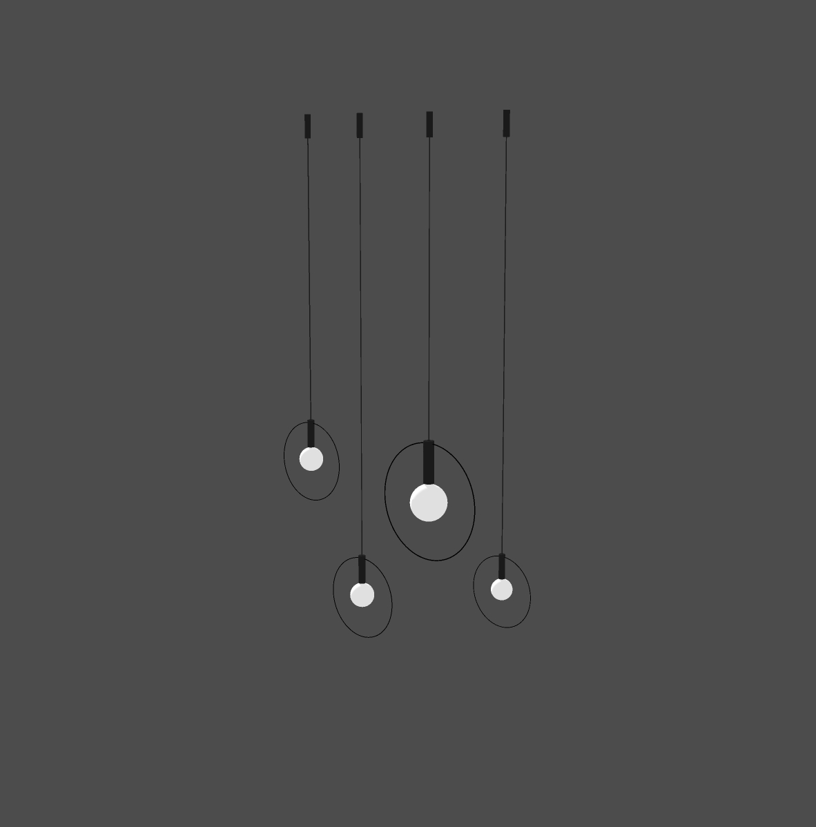 Hệ thống chiếu sáng được thể hiện trong hình ảnh bao gồm bốn đèn treo, mỗi đèn được thiết kế như một quả cầu ánh sáng lơ lửng trong khung tròn kim loại. Sự kết hợp giữa ánh sáng và hình khối tạo nên một tổng thể hài hòa và thanh lịch.
