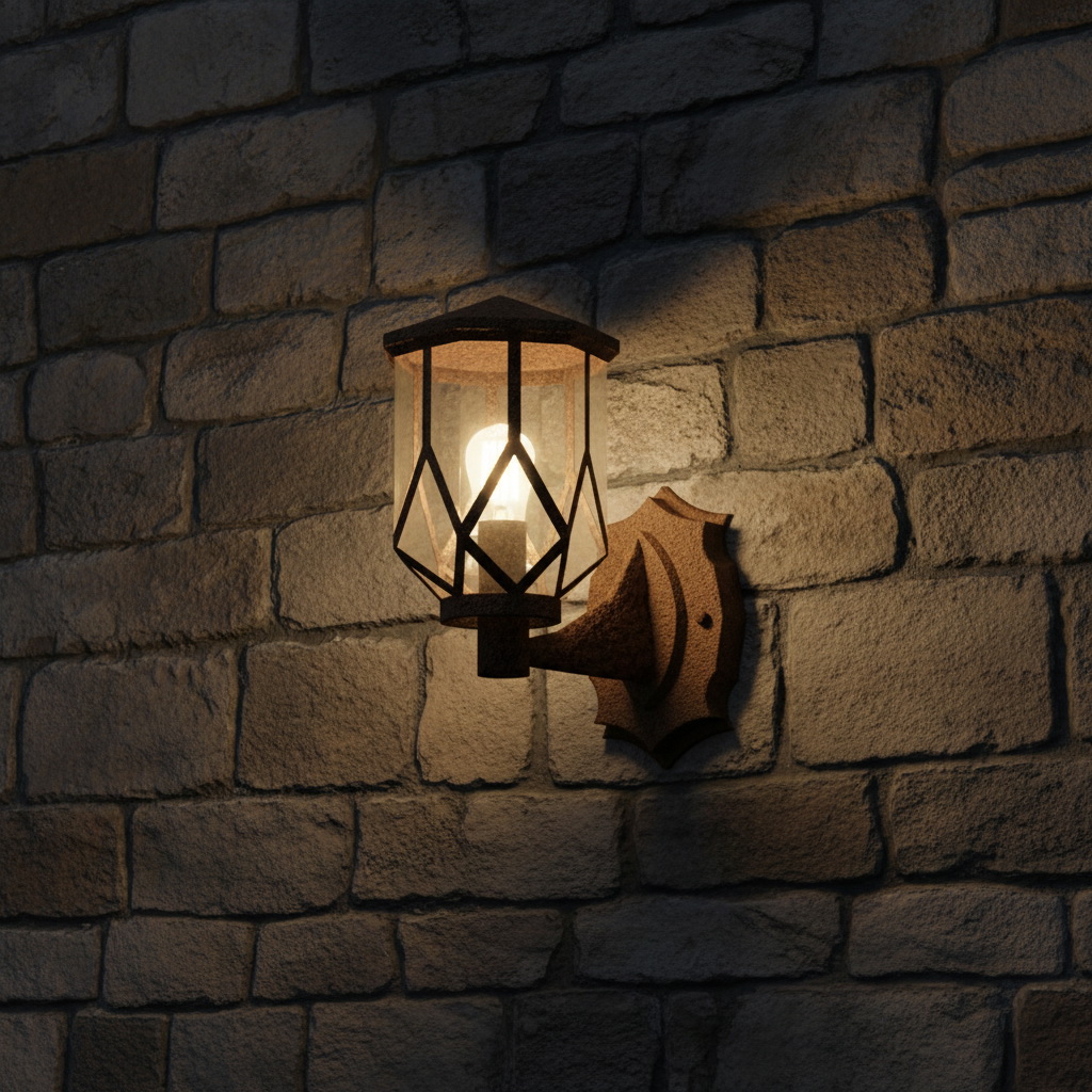 Hình ảnh cho thấy một chiếc đèn tường gắn trên tường đá với ánh sáng ấm áp, tạo không gian ấm cúng và sang trọng. Thiết kế của đèn có hình lục giác với khung kim loại cổ điển và chất liệu thủy tinh trong, giúp tối ưu hóa việc phát tán ánh sáng.