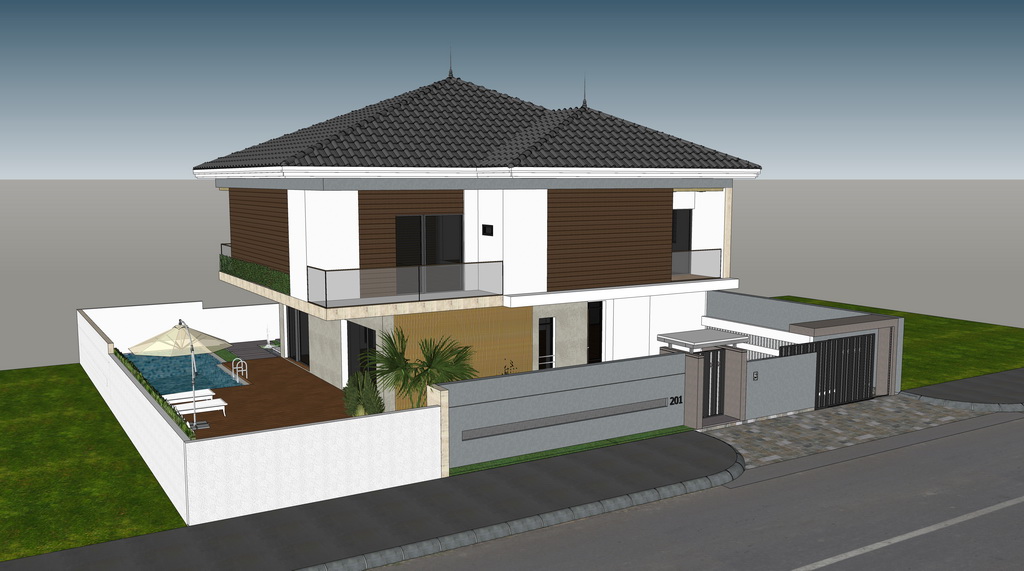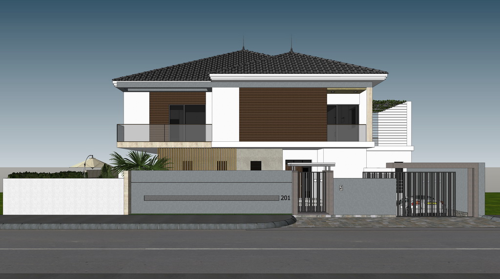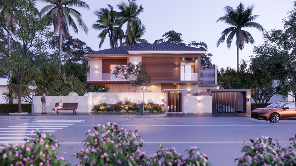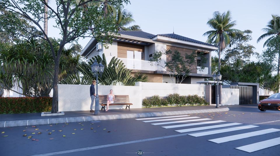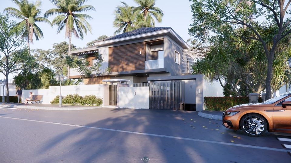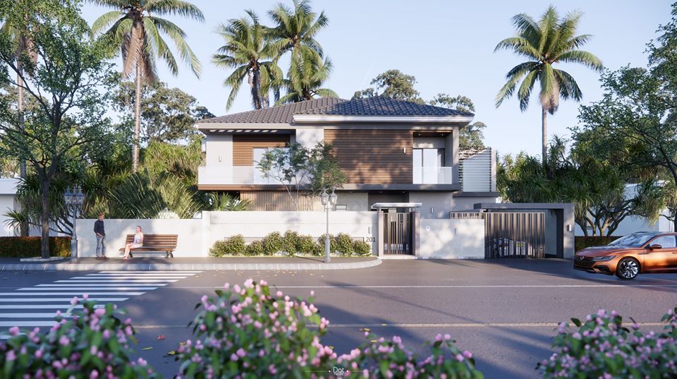 Mẫu thiết kế trong hình ảnh này thể hiện một ngôi nhà hai tầng với phong cách hiện đại, nằm giữa khung cảnh thiên nhiên thoáng đãng. Đặc điểm dễ nhận biết bao gồm mái ngói màu xám, hệ thống cửa sổ kính lớn và ban công rộng, giúp tối đa hóa ánh sáng tự nhiên. Kết hợp với cảnh quan xanh mát xung quanh là hàng cây dừa và cây cảnh nhỏ được trồng dọc theo hàng rào.