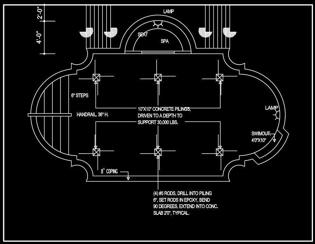 Bản vẽ cũng cung cấp các thông số kỹ thuật quan trọng như kích thước từng phần của hồ, độ sâu của móng cọc bê tông (10"x10" concrete pilings), hay phương pháp cài đặt thanh giằng (#5 rods, drilled into piling).