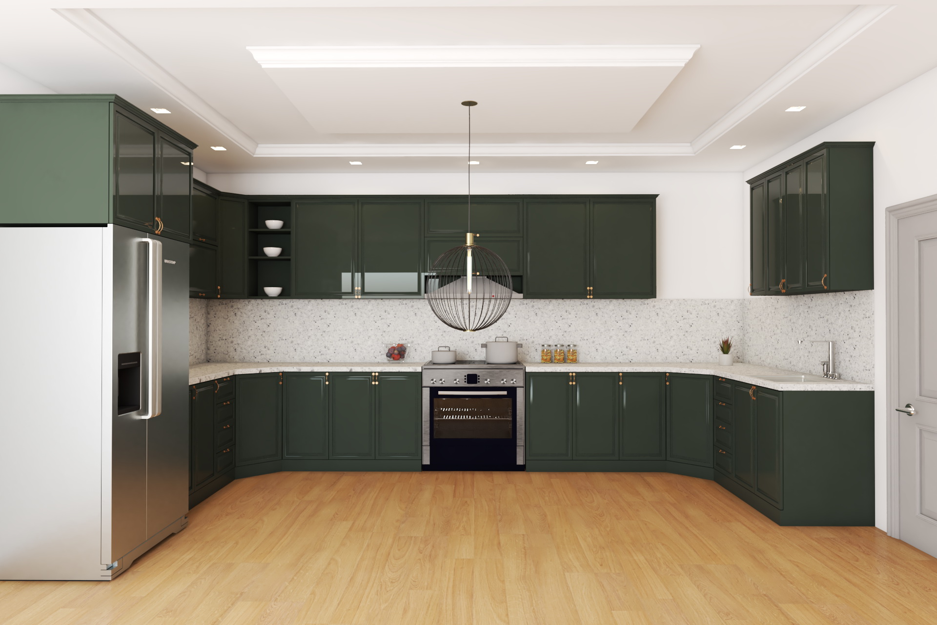 • 23. Mẫu Model Sketchup bếp chữ U tân cổ điển phối màu xanh Forest Green ấn tượng