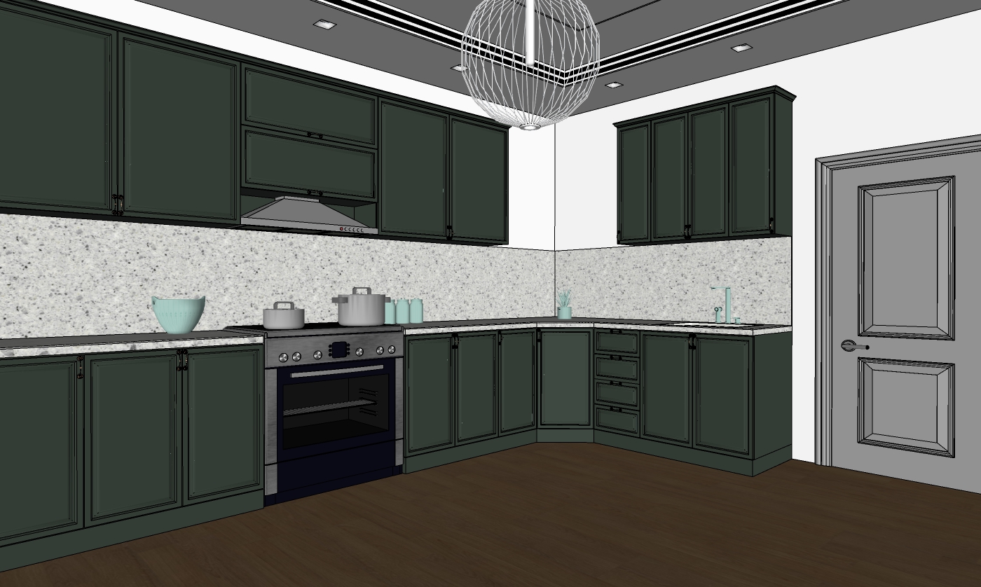 Mẫu Model Sketchup bếp chữ U tân cổ điển phối màu xanh Forest Green ấn tượng