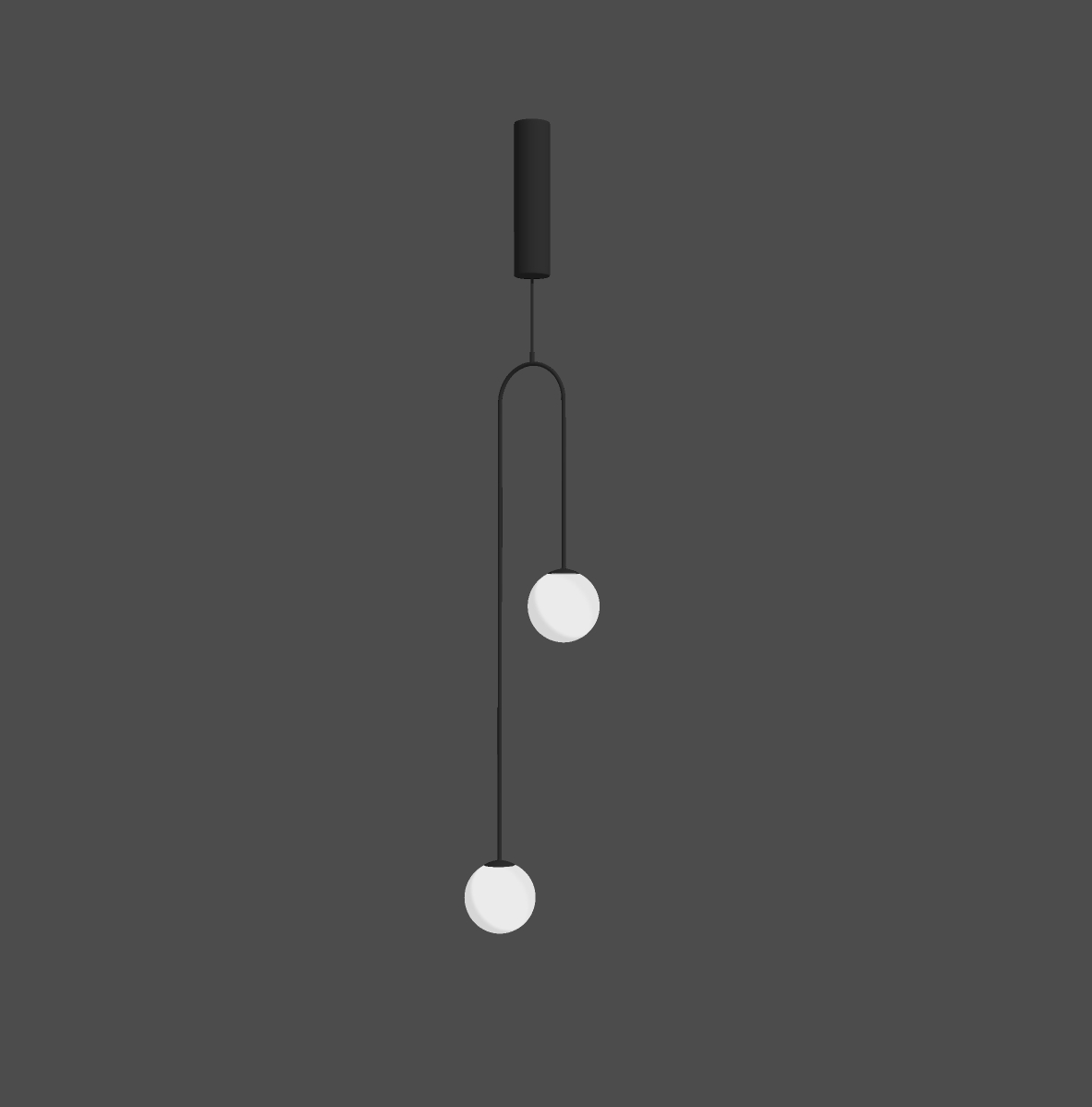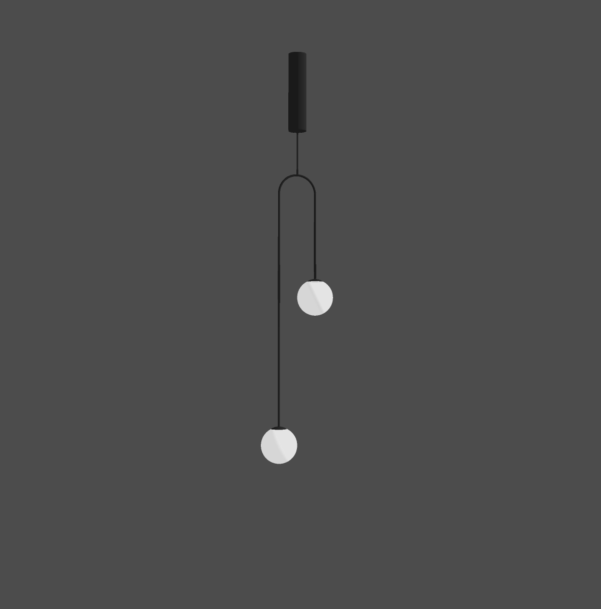 Hình ảnh hiển thị một chiếc đèn treo có thiết kế tối giản nhưng vô cùng ấn tượng. Đèn bao gồm hai bóng đèn tròn nằm ở hai độ cao khác nhau, được treo từ trần nhà bởi thanh kim loại màu đen mảnh mai. Điều này không chỉ tạo ra hiệu ứng ánh sáng độc đáo mà còn đem lại cảm giác sang trọng cho không gian.