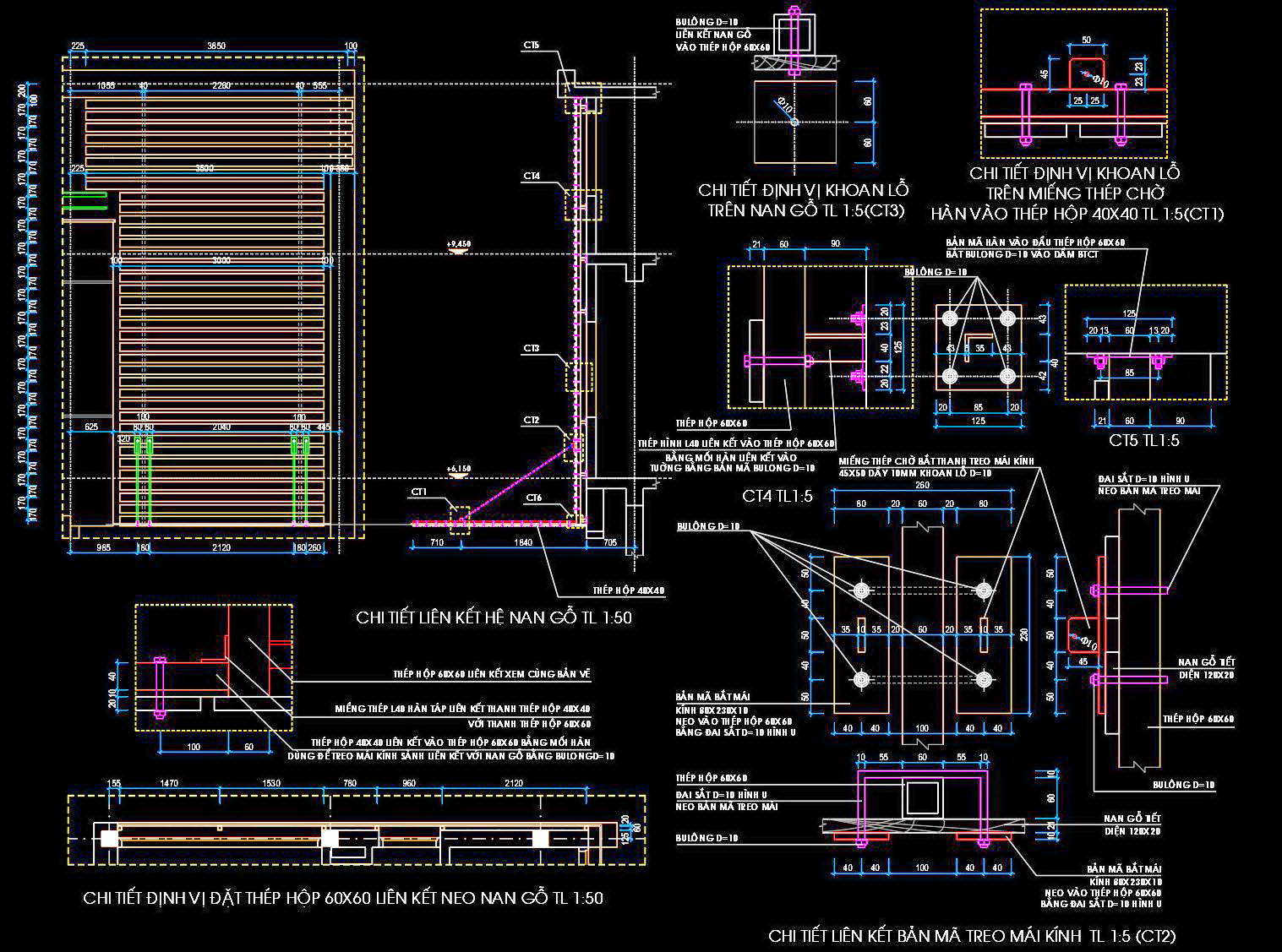 Bản vẽ tài liệu bao gồm nhiều chi tiết kỹ thuật rõ ràng và chính xác. Trong đó, có các phần chi tiết về cách định vị và khoan lỗ trên nan gỗ, cách liên kết nan gỗ với các khung thép, cách thiết kế và thi công móc treo cho mái kính, và cách neo các phần tử lại với nhau sao cho chắc chắn và bền vững.