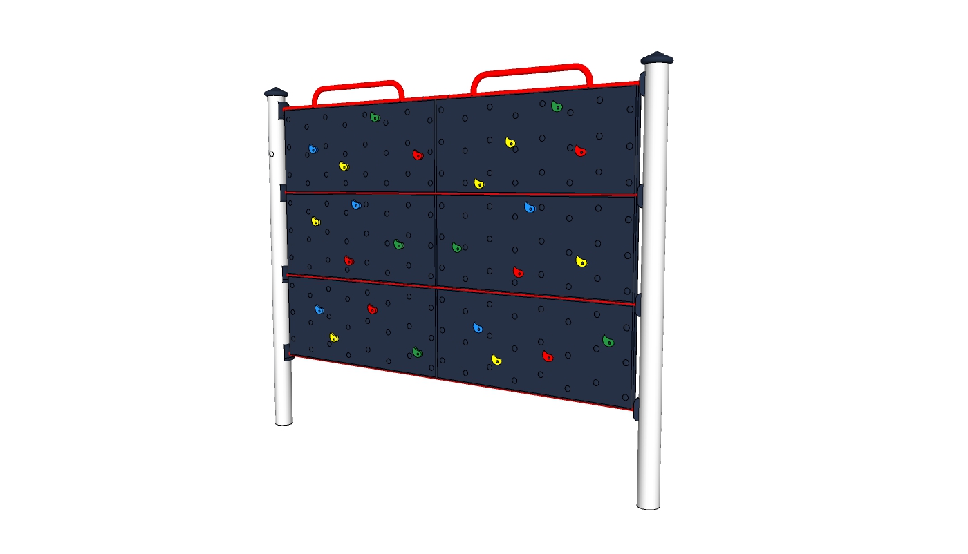 Mô hình trong hình ảnh là một tường leo núi phong cách hiện đại với kết cấu chuyên nghiệp và bền vững. Trên bề mặt tường có các khối leo nhiều màu sắc như đỏ, xanh lục, xanh dương và vàng, tạo điểm nhấn thú vị cho người dùng. Mô hình này dựng nền trên ba hàng dọc và ba hàng ngang, tạo thành một bề mặt rộng rãi và thử thách cho người leo.