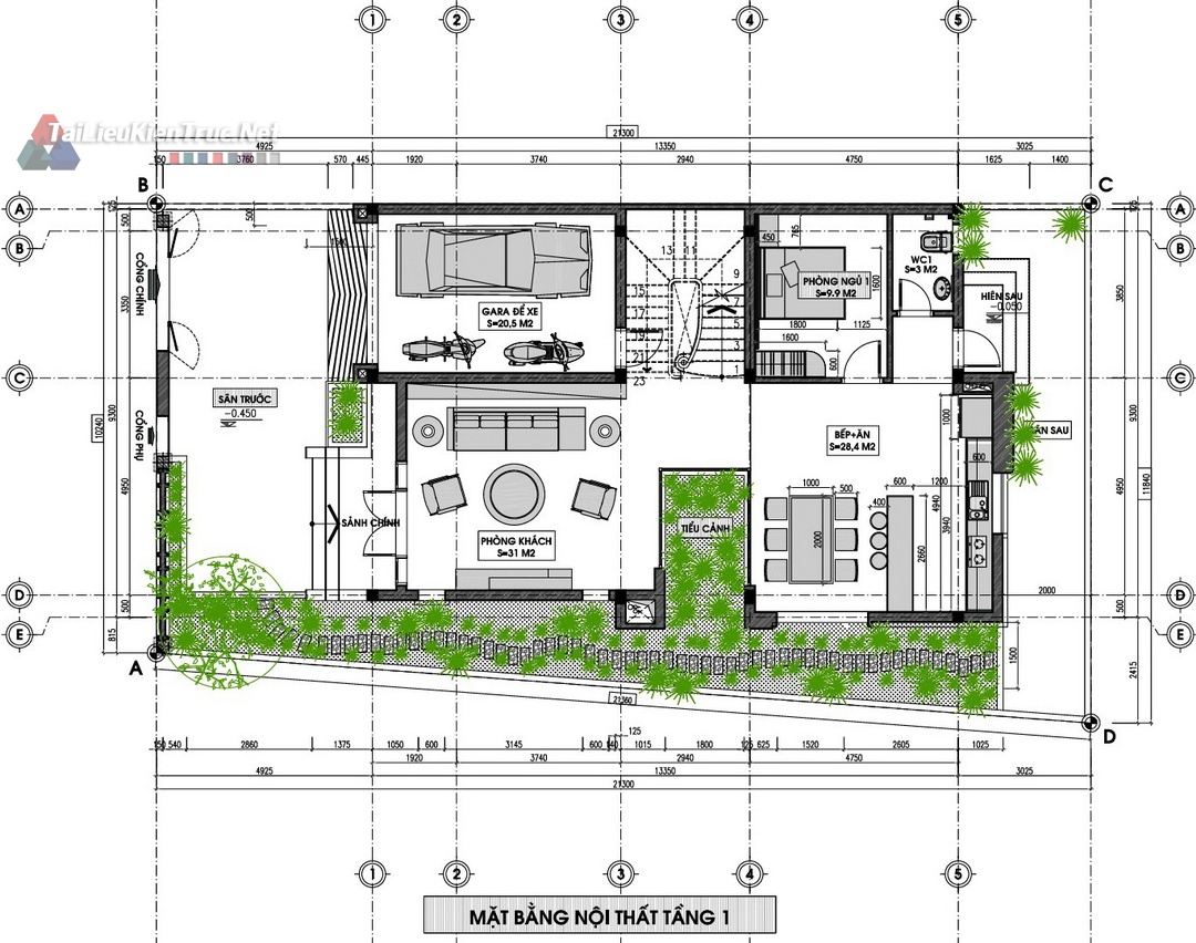 Chi tiết: Bao gồm Phòng Khách () rộng rãi, Bếp + Ăn () liên thông, Gara ô tô (), cùng với các khu vực phụ trợ như Sân trước, Sân sau, Sảnh chính. Bố trí công năng mạch lạc, dễ dàng tiếp cận và sử dụng.