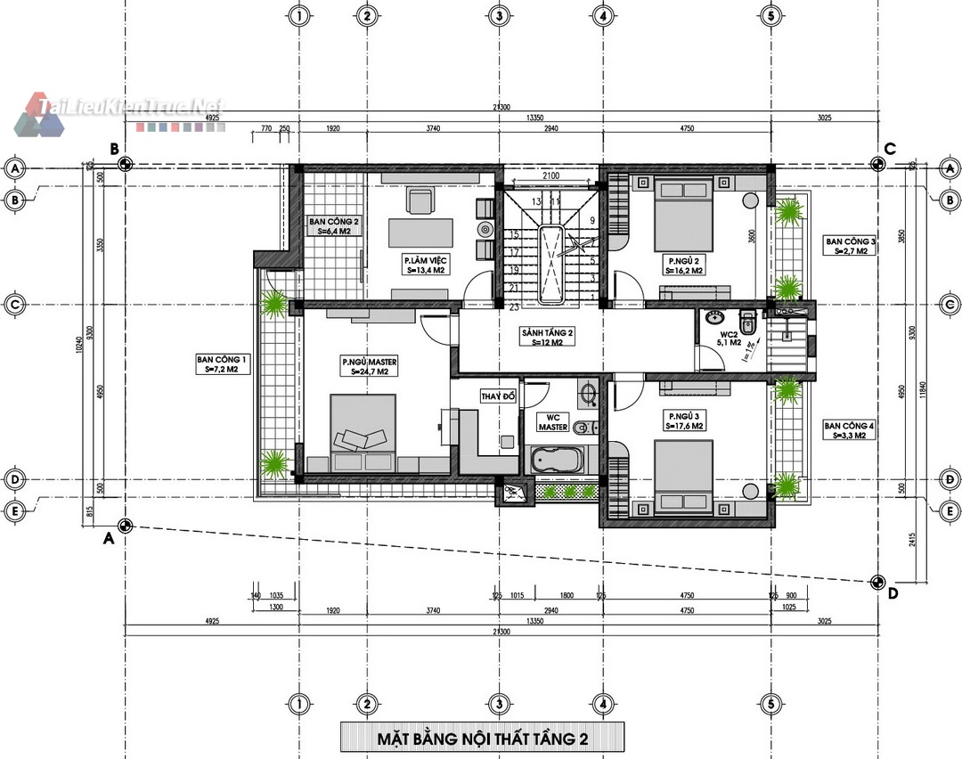 Chi tiết: Bao gồm 3 phòng ngủ, trong đó có Phòng Ngủ Master () lớn với WC khép kín, 2 Phòng Ngủ thường ( và (), cùng Phòng Làm Việc () và các ban công rộng. Giải pháp chiếu sáng và thông gió tự nhiên được ưu tiên tối đa.