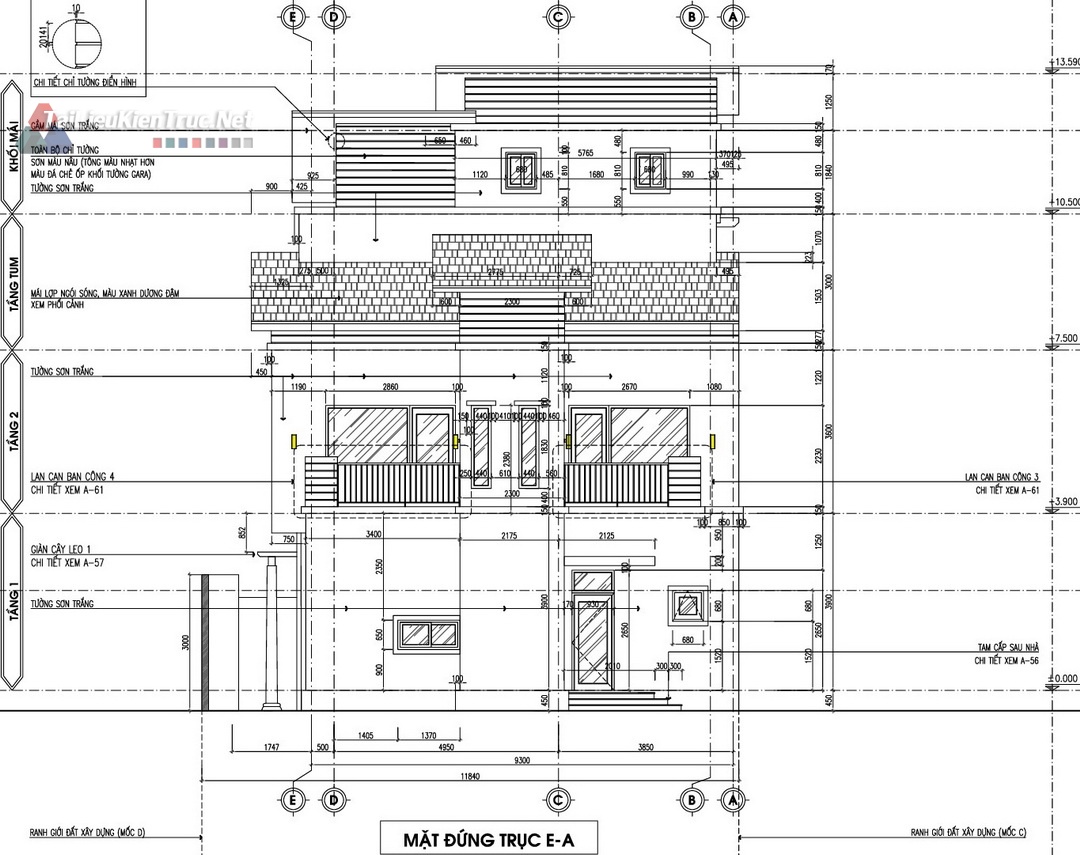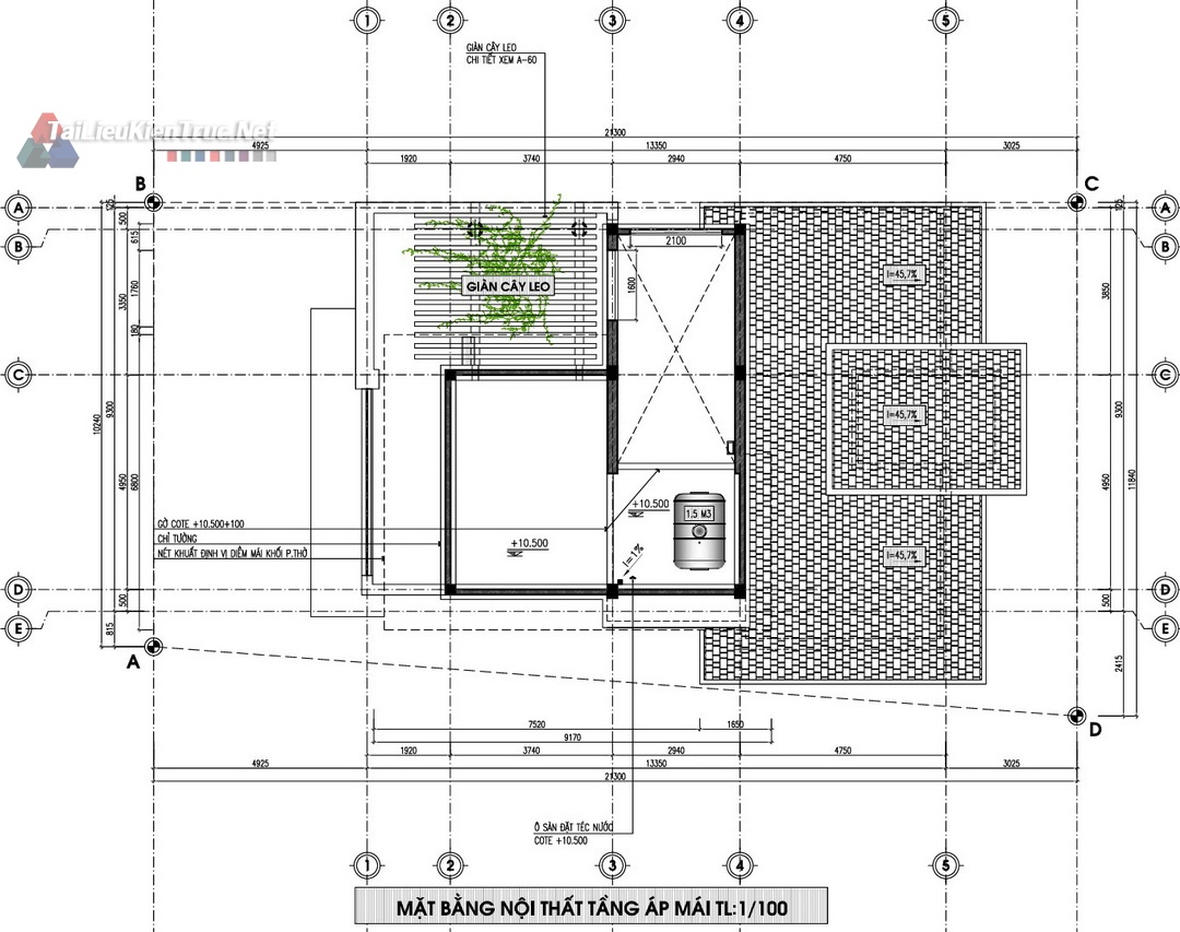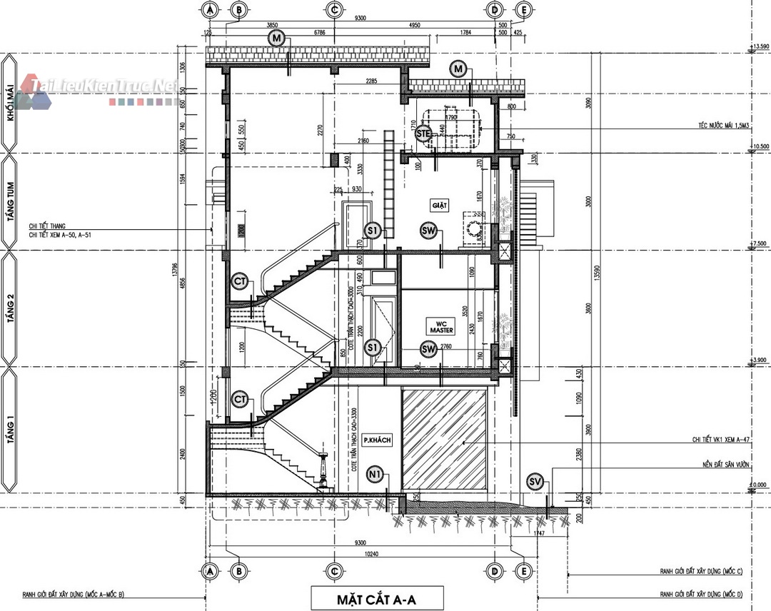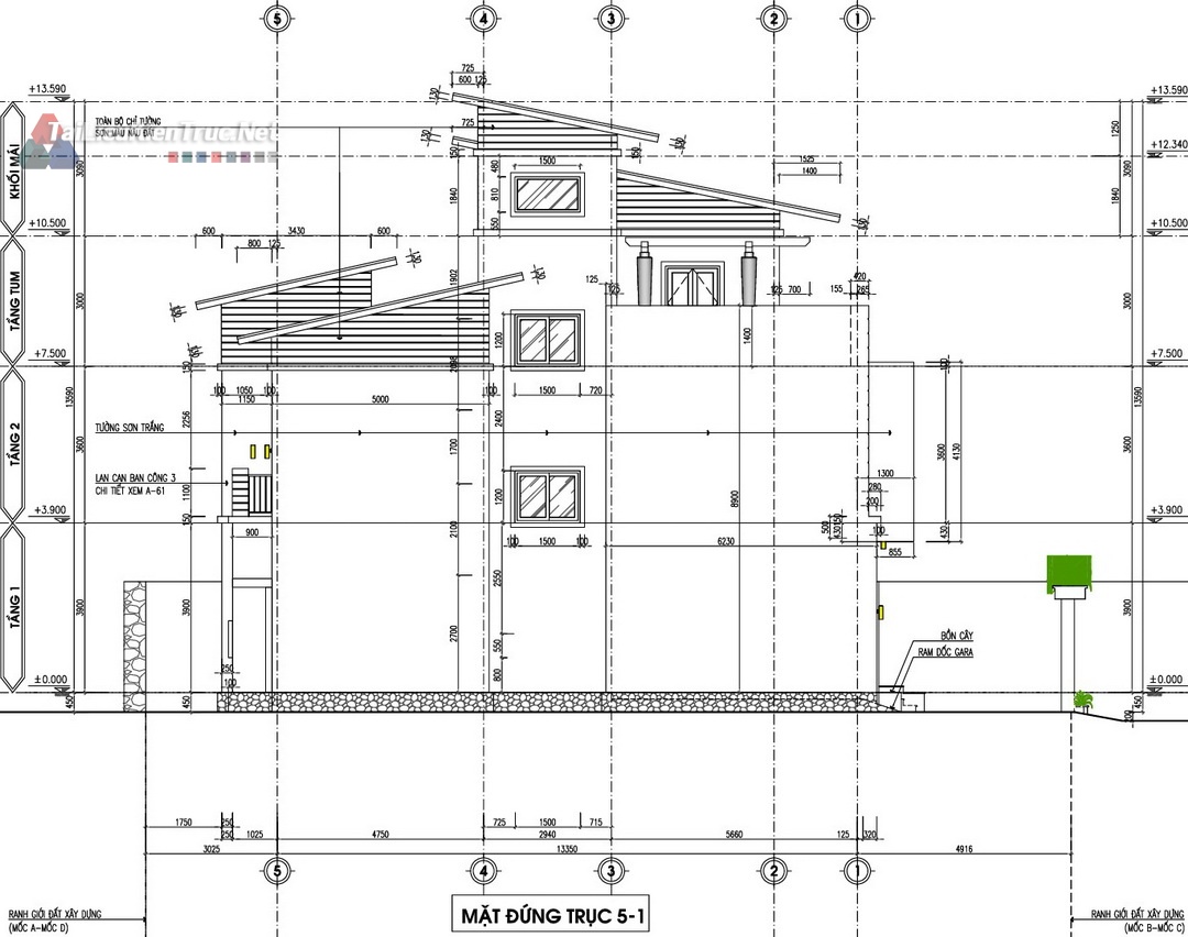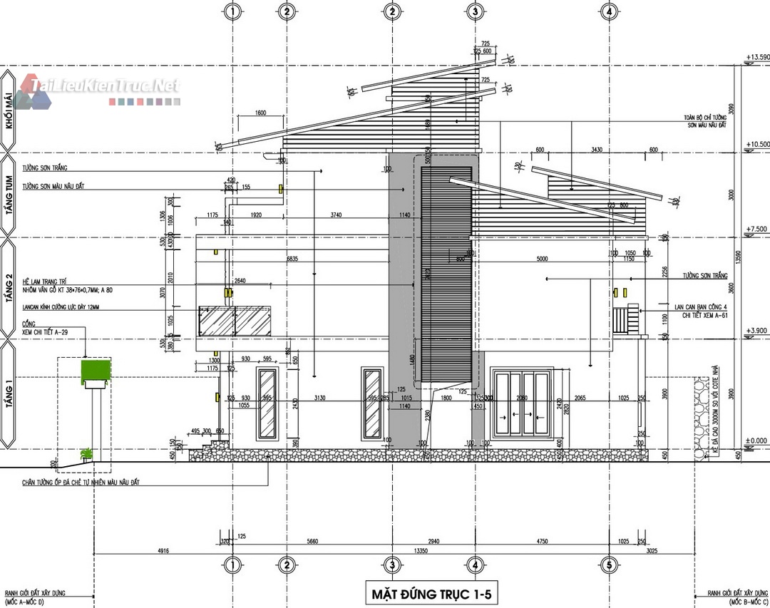 Mặt bằng Tum/Mái: Ngoài công năng sử dụng, hồ sơ làm rõ vị trí bồn nước, ống thoát nước, và cấu tạo giàn cây leo trên mái, thể hiện sự quan tâm đến kiến trúc xanh và giải pháp chống nóng.