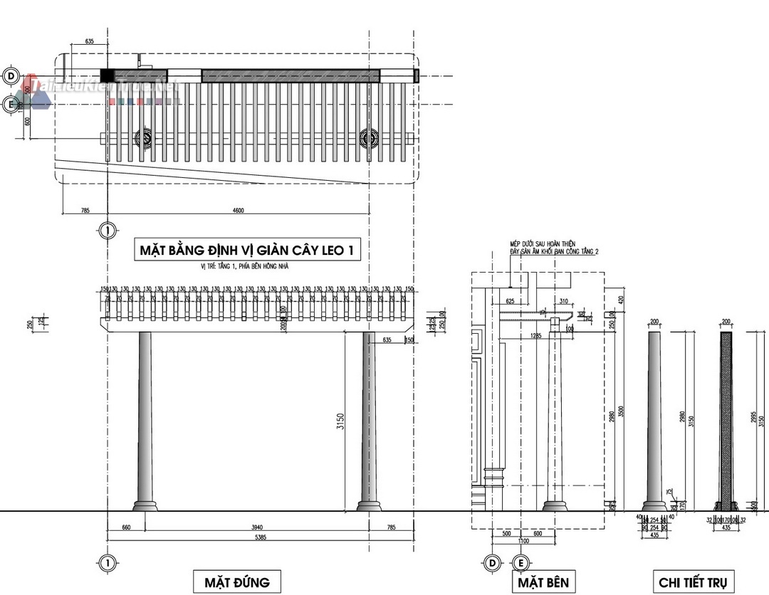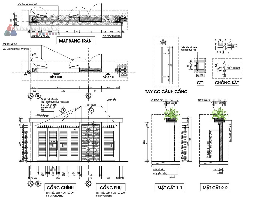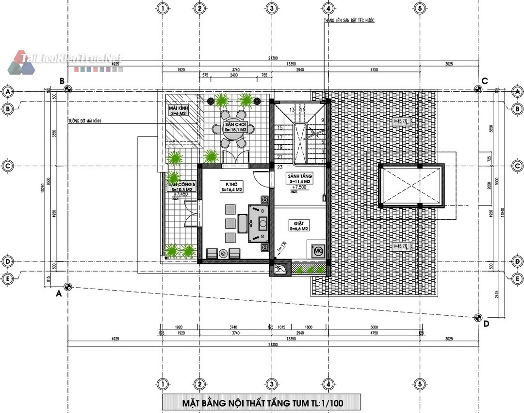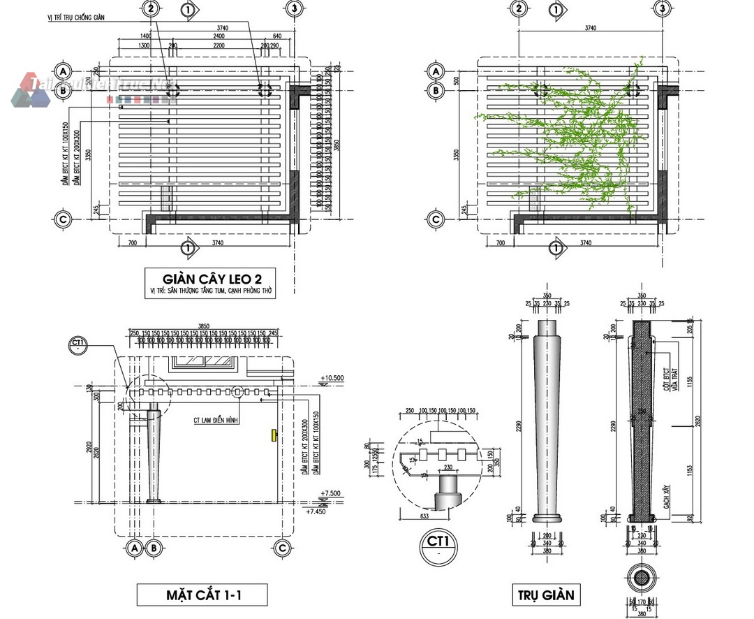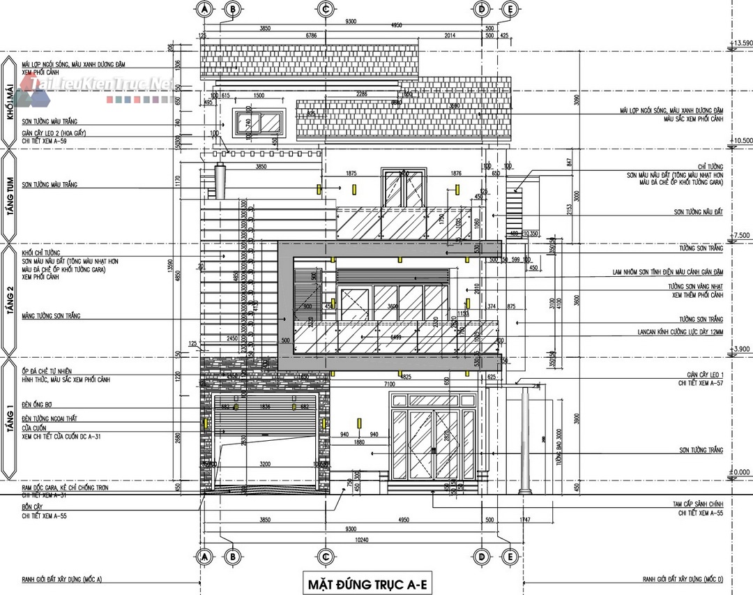 Mặt bằng Tum/Mái: Ngoài công năng sử dụng, hồ sơ làm rõ vị trí bồn nước, ống thoát nước, và cấu tạo giàn cây leo trên mái, thể hiện sự quan tâm đến kiến trúc xanh và giải pháp chống nóng.