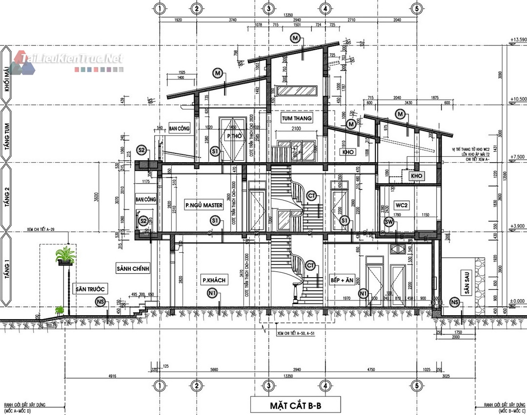 Mặt Cắt A-A & B-B: Thể hiện rõ chiều cao thông thủy các tầng, kết cấu thang (chi tiết cầu thang), vị trí cửa, và mối liên kết giữa các không gian. Cung cấp thông tin cao độ chi tiết (ví dụ: Tầng 1 ±0.000, Tầng 2 +3.900, Tầng Tum +7.500, Đỉnh mái +13.590).