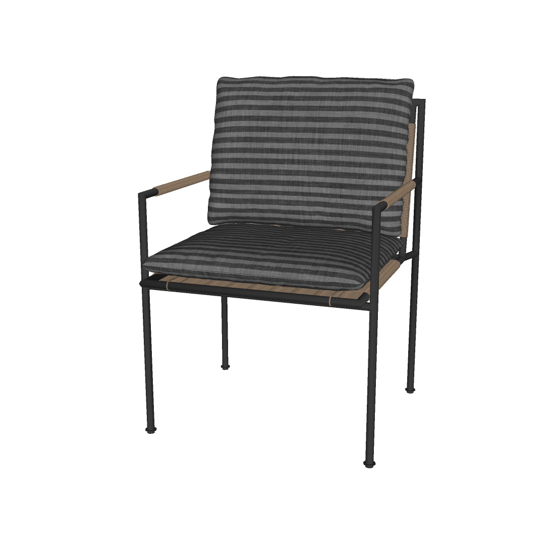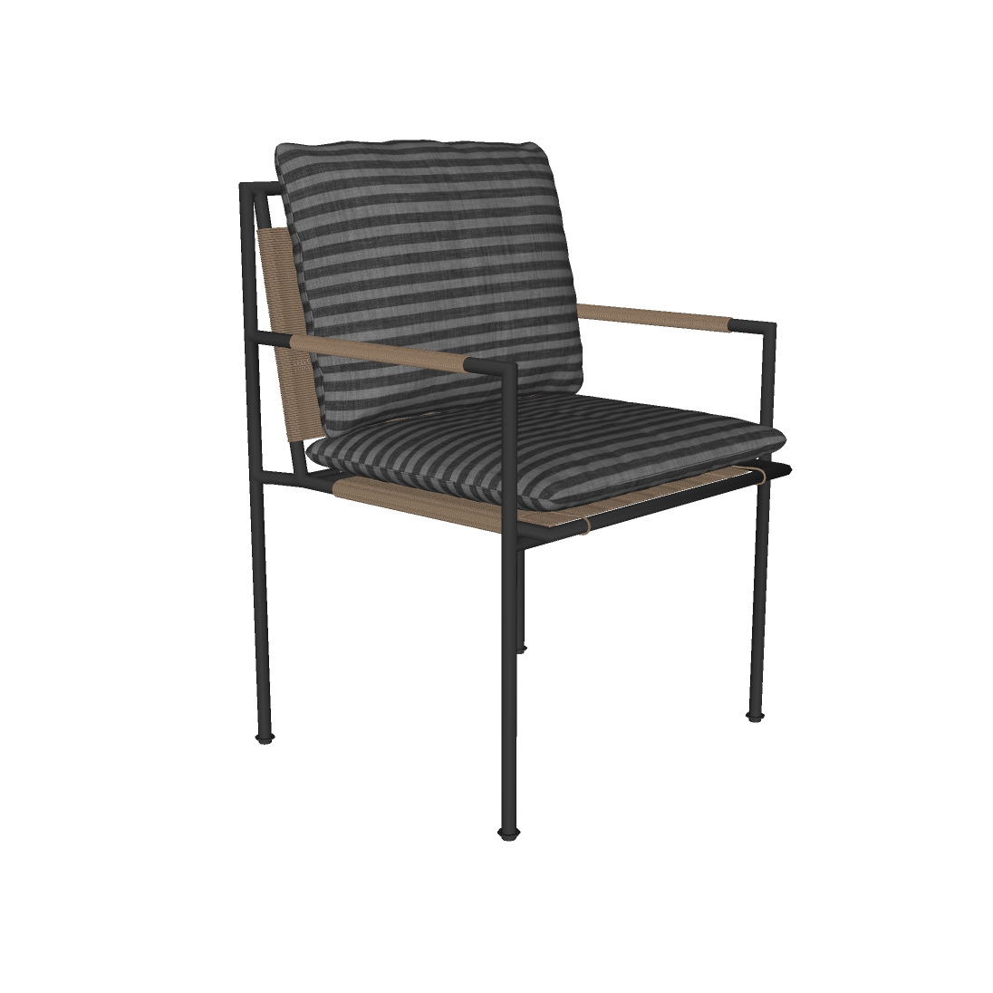 Chiếc ghế trong hình ảnh được thiết kế với sự tinh tế, chú trọng vào từng chi tiết nhỏ nhất. Ghế bao gồm một bộ khung kim loại màu đen chắc chắn, kết hợp với gối tựa và đệm ngồi có họa tiết kẻ sọc tinh tế. Màu sắc trung tính của ghế giúp nó dễ dàng hài hòa với nhiều không gian nội thất khác nhau.