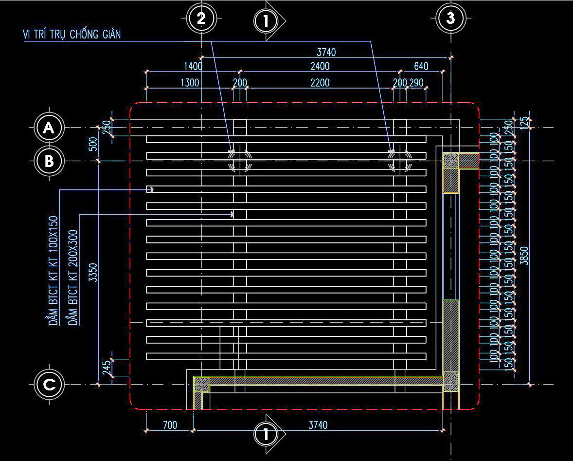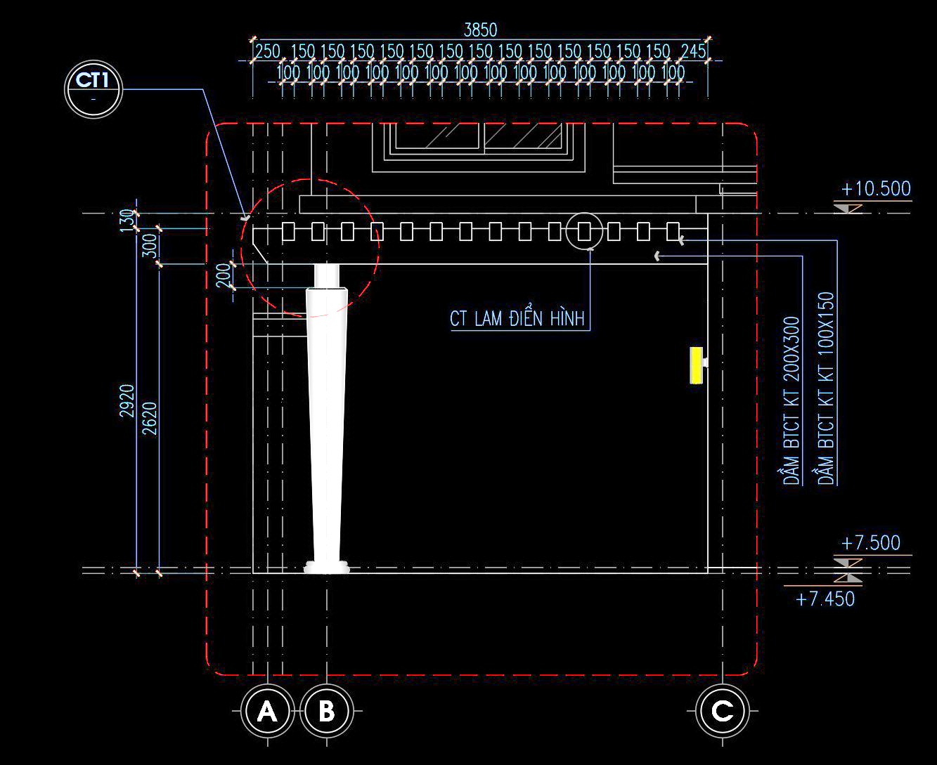 Các chi tiết kỹ thuật được thể hiện rõ ràng trên bản vẽ với kích thước tổng thể như chiều dài 3850 mm, chiều rộng 2920 mm và các thông số cụ thể của cấu kiện như dầm BTCT kích thước 200x300 mm và 100x150 mm, cho phép các kỹ sư dễ dàng tính toán và áp dụng vào thực tế.