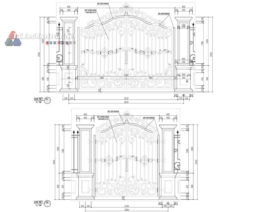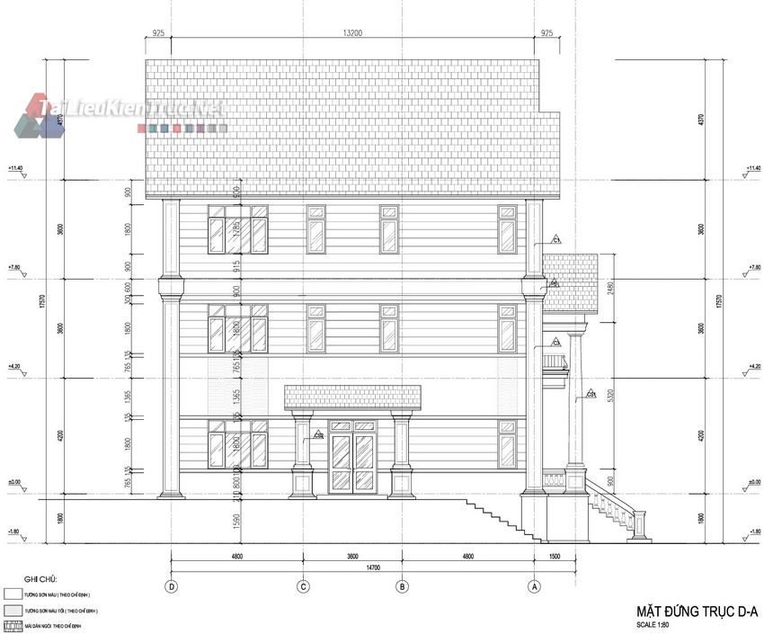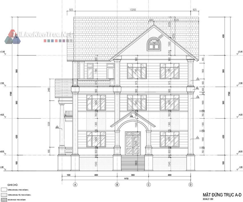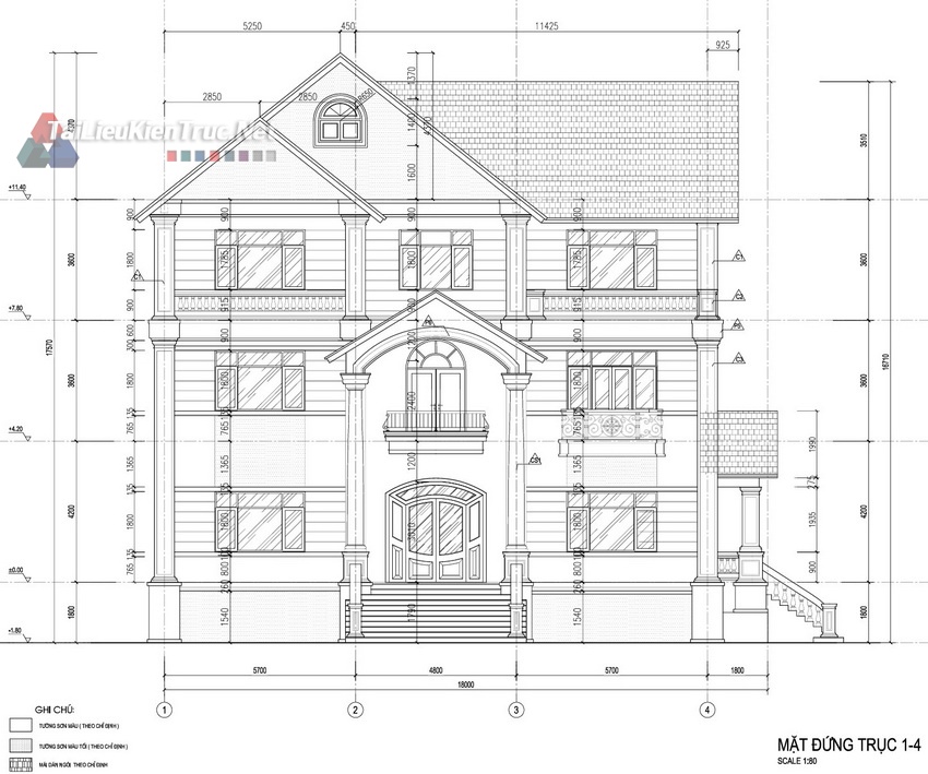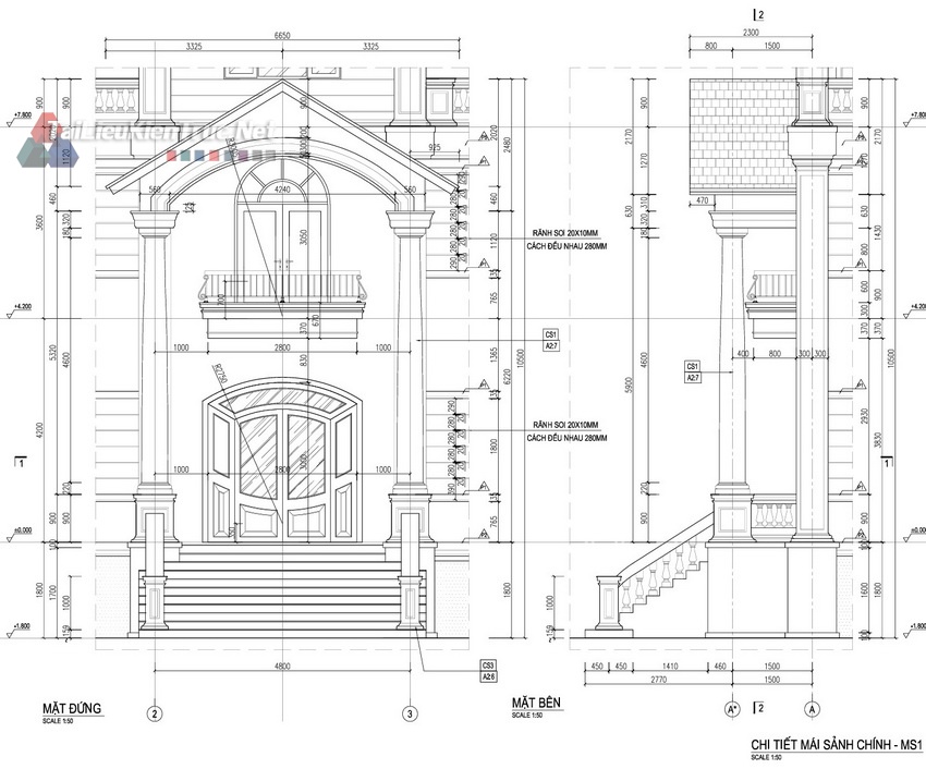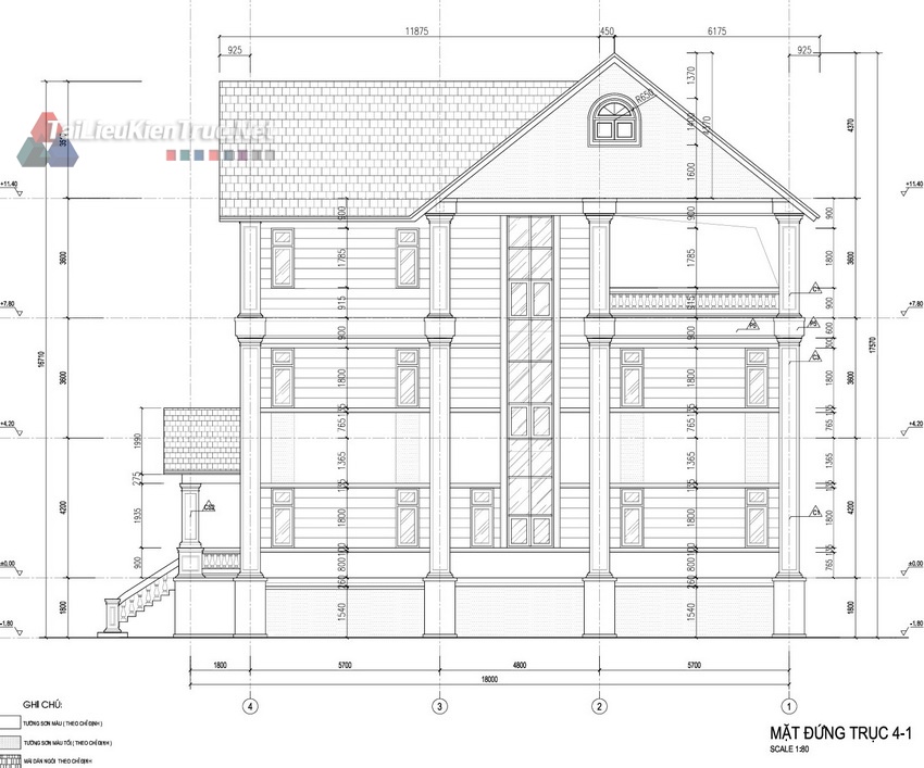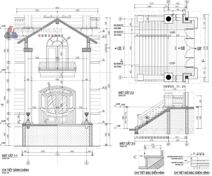 - Chi tiết mặt đứng; sảnh, tam cấp, cột, phào chỉ, mái