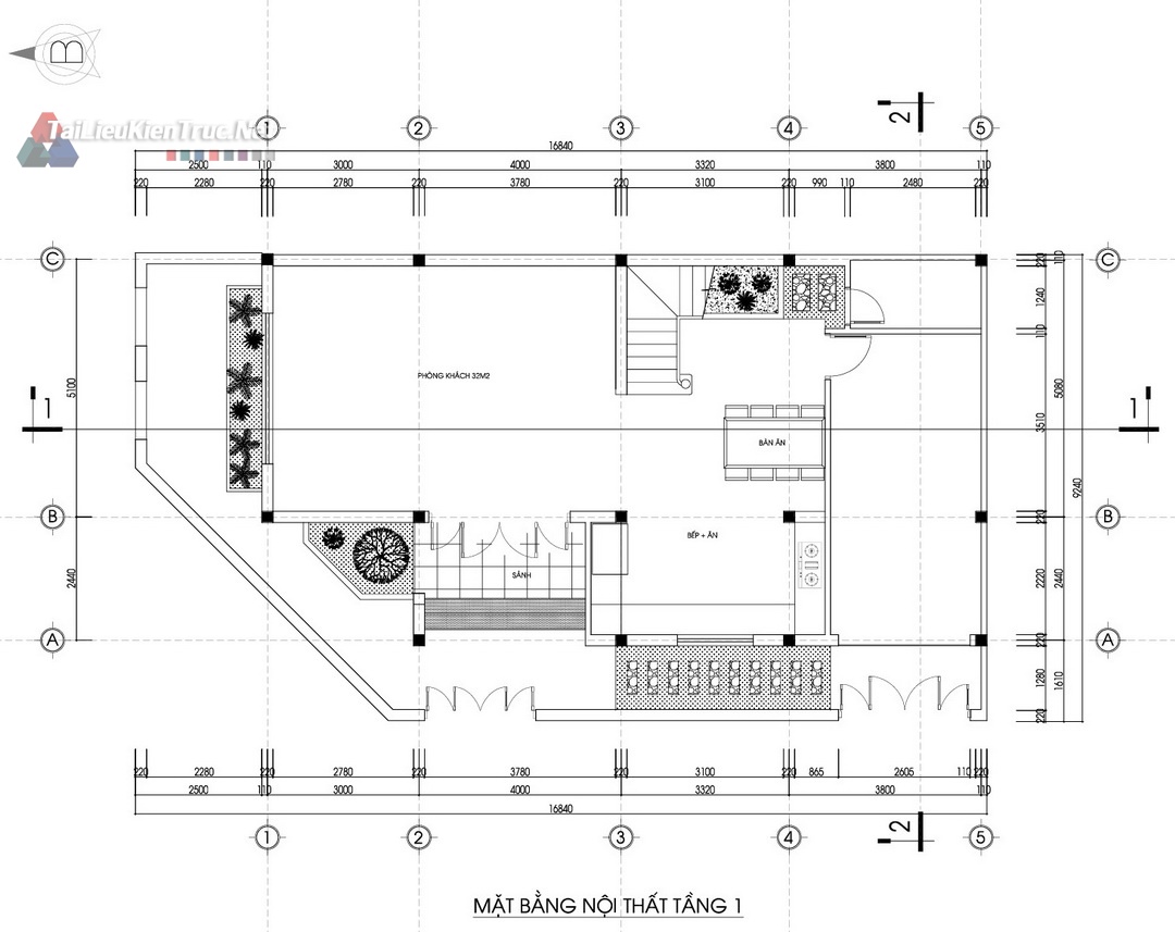 Tầng 1: Tập trung vào không gian chung (Phòng Khách 32m2, Bếp + Bàn Ăn) và khu vực tiếp cận (Sảnh, Sân). Thiết kế xéo ở mặt tiền (Trục A-1) tạo điểm nhấn linh hoạt và mở rộng không gian sân trước.