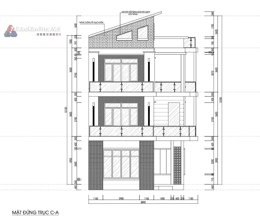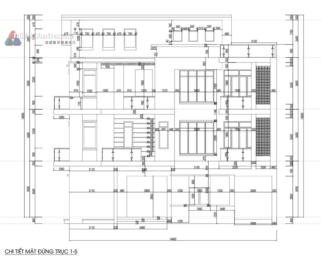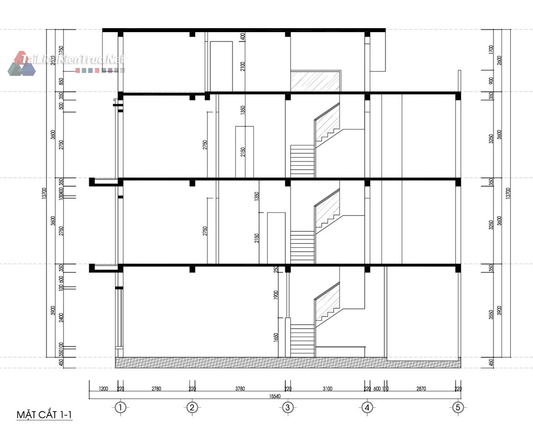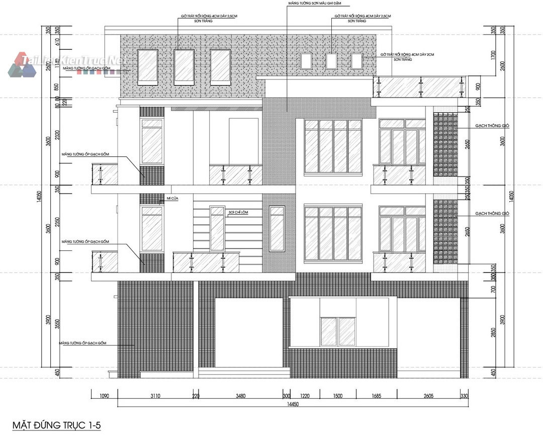 Các bản vẽ kỹ thuật cốt lõi như Mặt đứng (Trục 1-5, Trục C-A) và Mặt cắt (Cắt 1-1) cung cấp thông tin về kích thước, cao độ, chi tiết vật liệu hoàn thiện, và cấu tạo cầu thang.