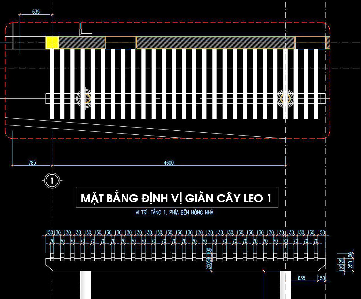Trong hình ảnh, ta thấy bản vẽ chi tiết của dàn dây leo với các thông số kích thước cụ thể. Từng phần của dàn dây leo được mô tả rõ ràng, với chú thích và kích thước cụ thể để dễ dàng tham khảo trong quá trình thiết kế và thi công.