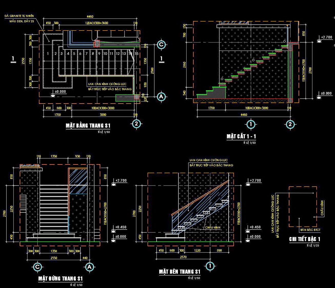 Hình ảnh thể hiện các bản vẽ chi tiết của cầu thang, bao gồm các mặt cắt, mặt đứng, và mặt bên của công trình. Các chi tiết được trình bày rõ ràng đến từng kích thước cụ thể, từ kích thước lan can, bậc cầu thang đến các thông số vật liệu sử dụng.