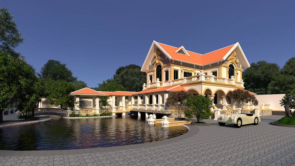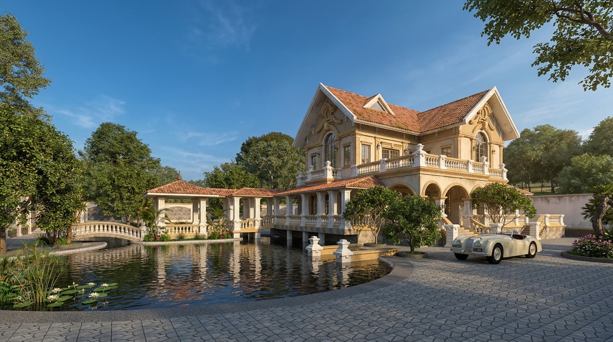 Mô hình này mang đến một góc nhìn toàn cảnh về kiến trúc biệt thự. Từ góc nhìn trực diện, ngôi nhà hiện lên với kiến trúc cổ điển, sử dụng vật liệu từ đá và gỗ, tạo nên vẻ trang nhã và sang trọng. Mái ngói đỏ truyền thống góp phần tạo nên cái nhìn ấm cúng, đậm nét văn hóa dân tộc.