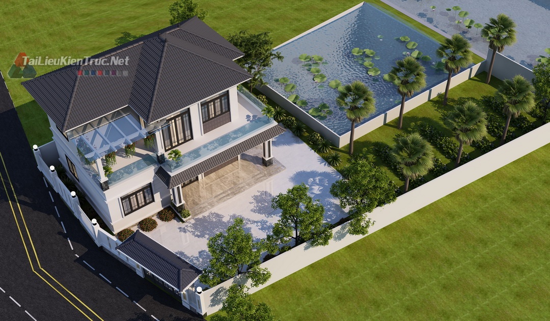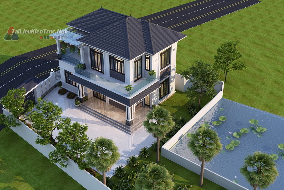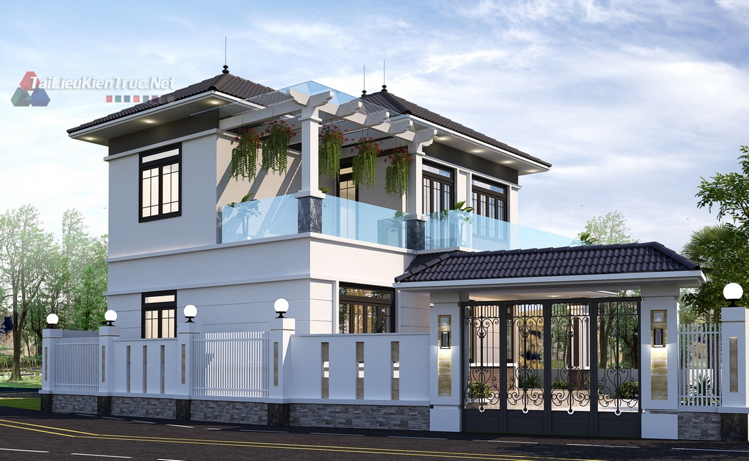 Hồ sơ thiết kế biệt thự 2 tầng 12x8m full kiến trúc và ảnh phối cảnhCông trình nổi bật với tông màu trắng – nâu – đen chủ đạo, kết hợp vật liệu ốp gạch giả đá và hệ cửa nhôm kính cao cấp, giúp không gian đón sáng tối đa và mở rộng tầm nhìn ra sân vườn.