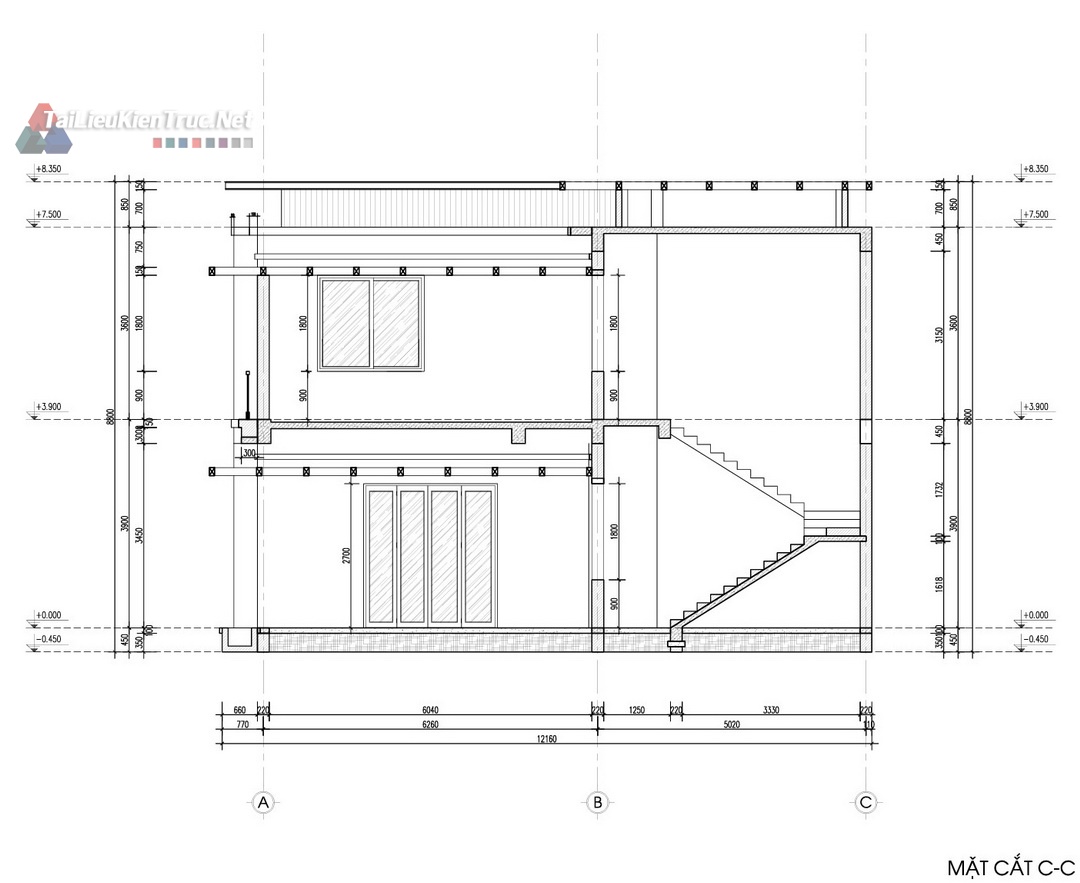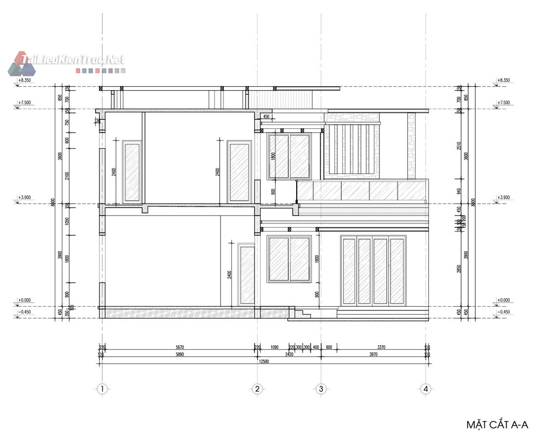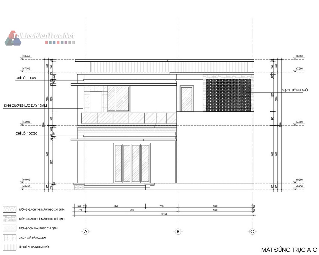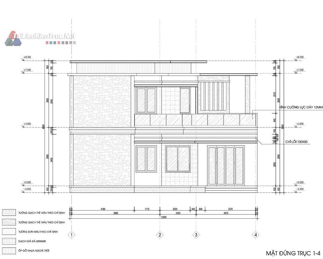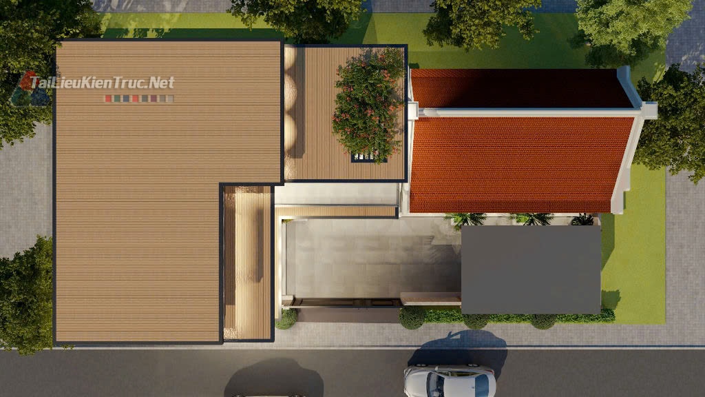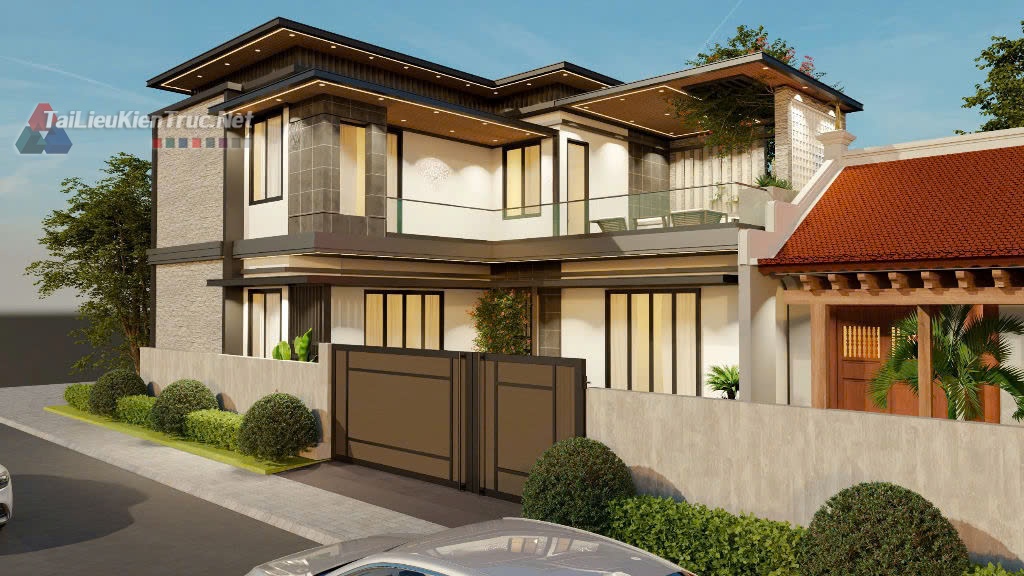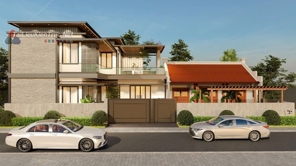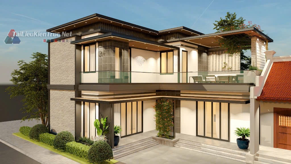 Công trình nổi bật với hệ mái bằng kết hợp lam gỗ và vật liệu ốp tường đá tự nhiên, tạo nên sự mạnh mẽ, vững chãi và sang trọng. Mặt tiền được thiết kế mở rộng tối đa với các mảng kính lớn, giúp lấy sáng và thông gió tự nhiên cho toàn bộ không gian bên trong