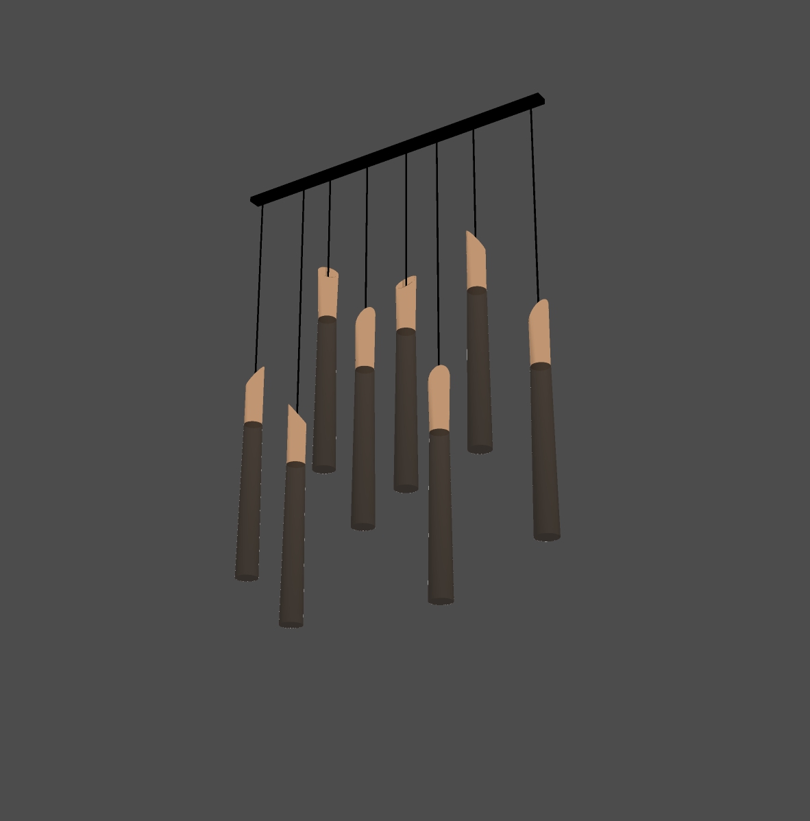 Bộ đèn thả trần này có cấu trúc từ các ống hình trụ được treo đều đặn từ một thanh ngang. Với chiều dài đa dạng, các ống này tạo ra một hiệu ứng thị giác độc đáo, làm nổi bật sự tinh tế trong thiết kế nội thất. Màu sắc chủ đạo là sự kết hợp giữa tông đen tuyền và màu gỗ tự nhiên, tạo ra sự hài hòa và bắt mắt.