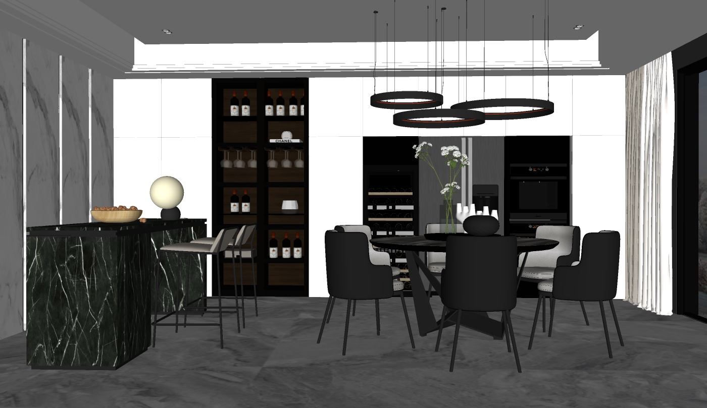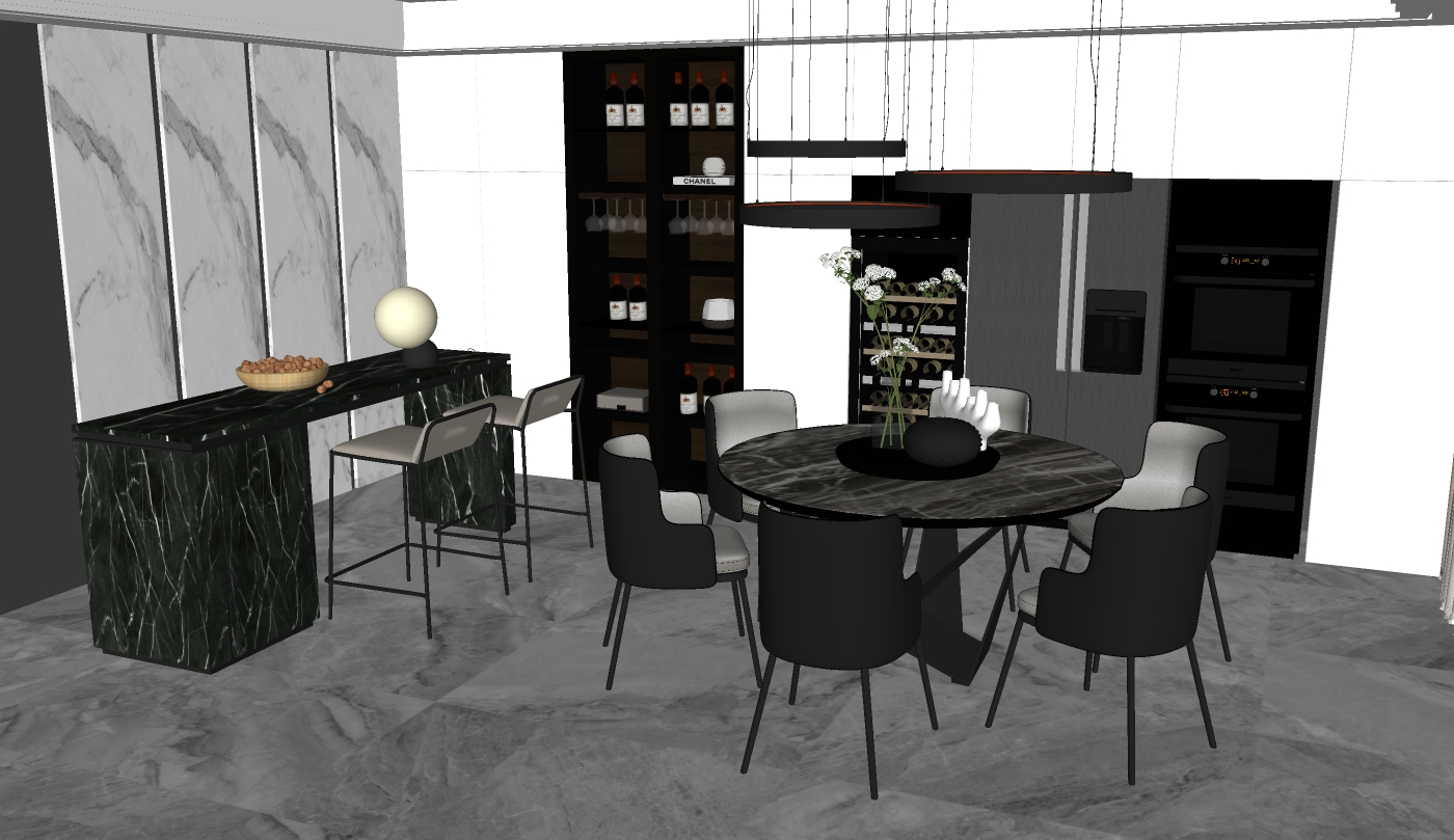 Model sketchup bếp và bàn ăn tròn hiện đại