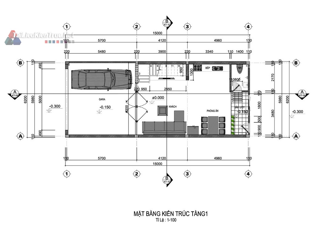 • Tầng 1 (Cos ±0.000): Gara ô tô (GARA), Phòng Khách (KHÁCH), Phòng Ăn (PHÒNG ĂN) và Bếp (BẾP).