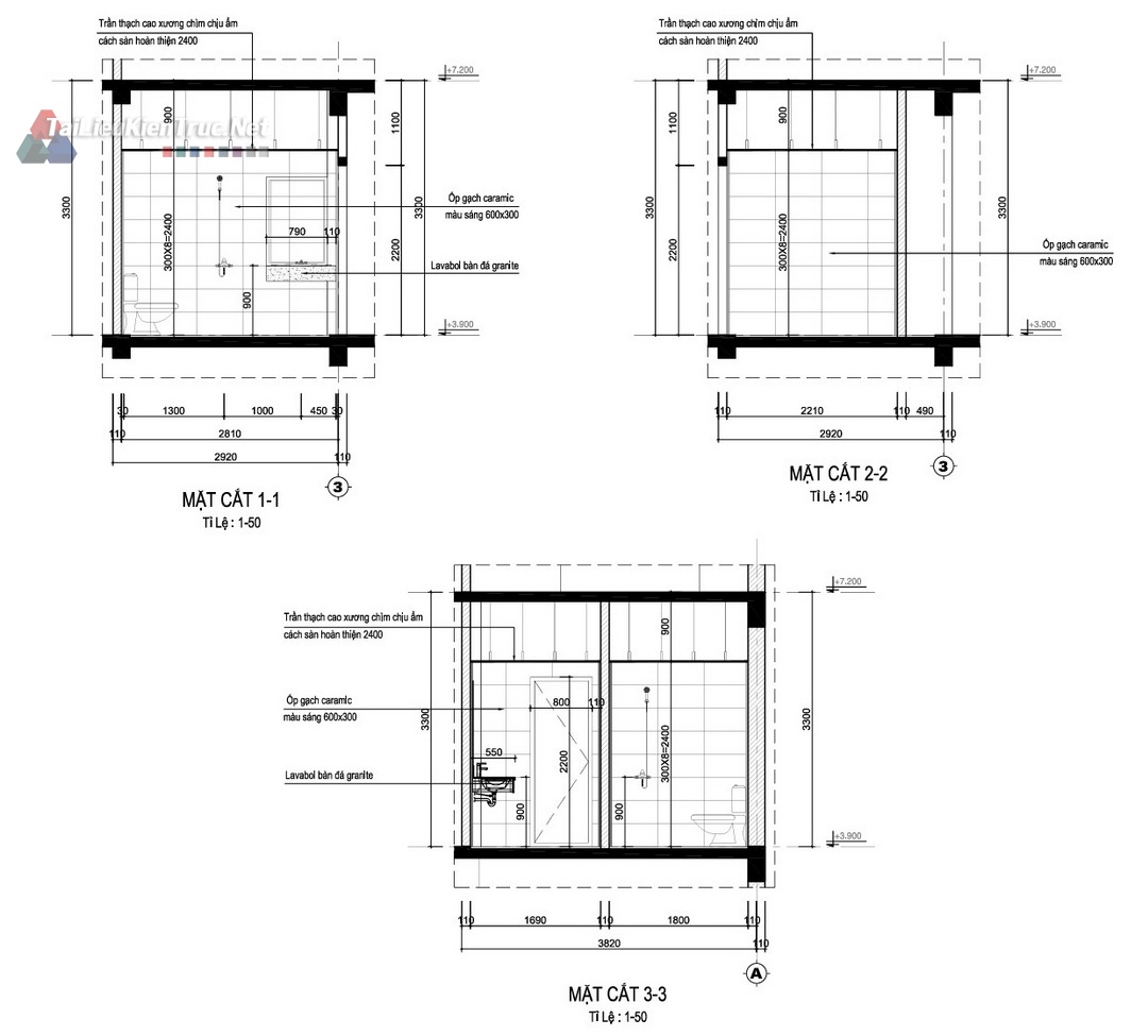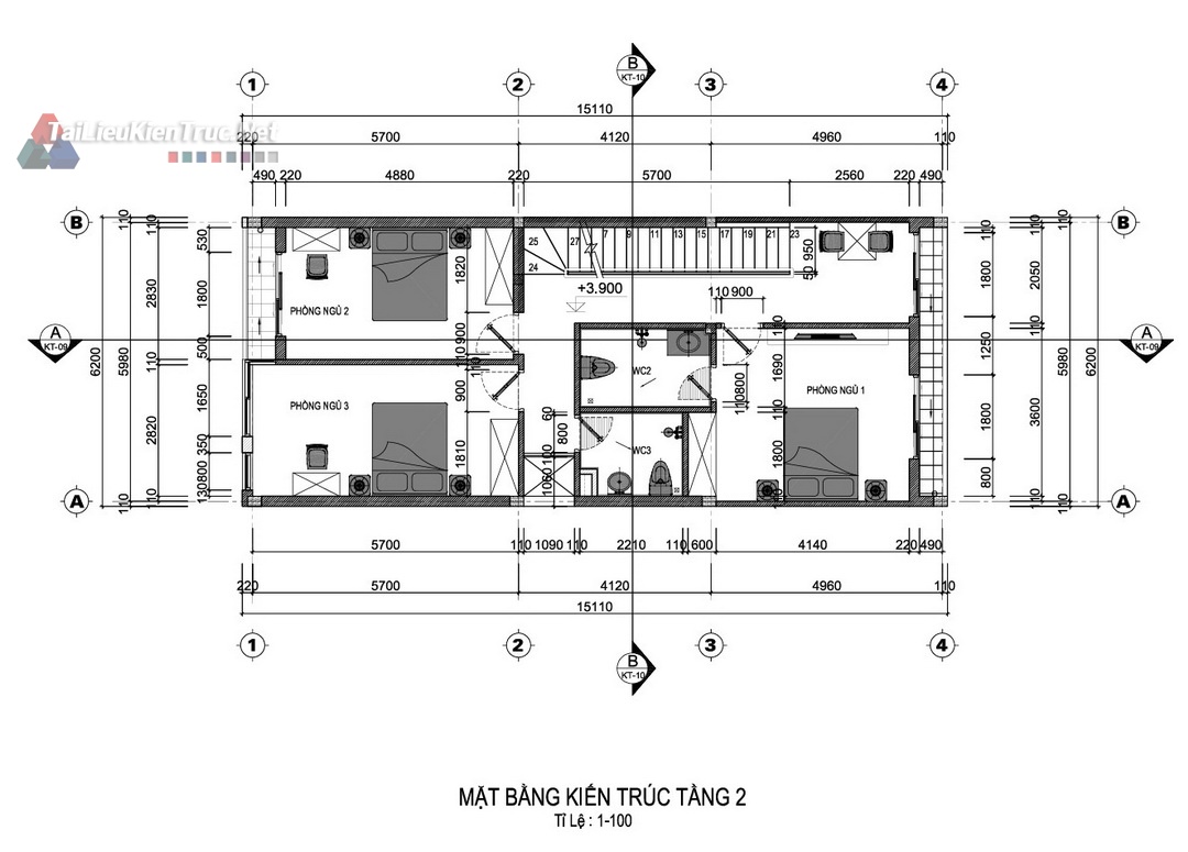 • Tầng 2 (Cos +3.900): 03 Phòng Ngủ (PHÒNG NGỦ 1, PHÒNG NGỦ 2, PHÒNG NGỦ 3) và 02 nhà vệ sinh chung (WC2, WC3).