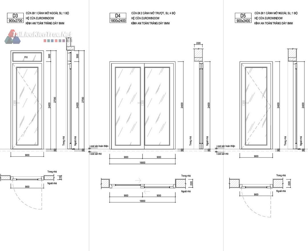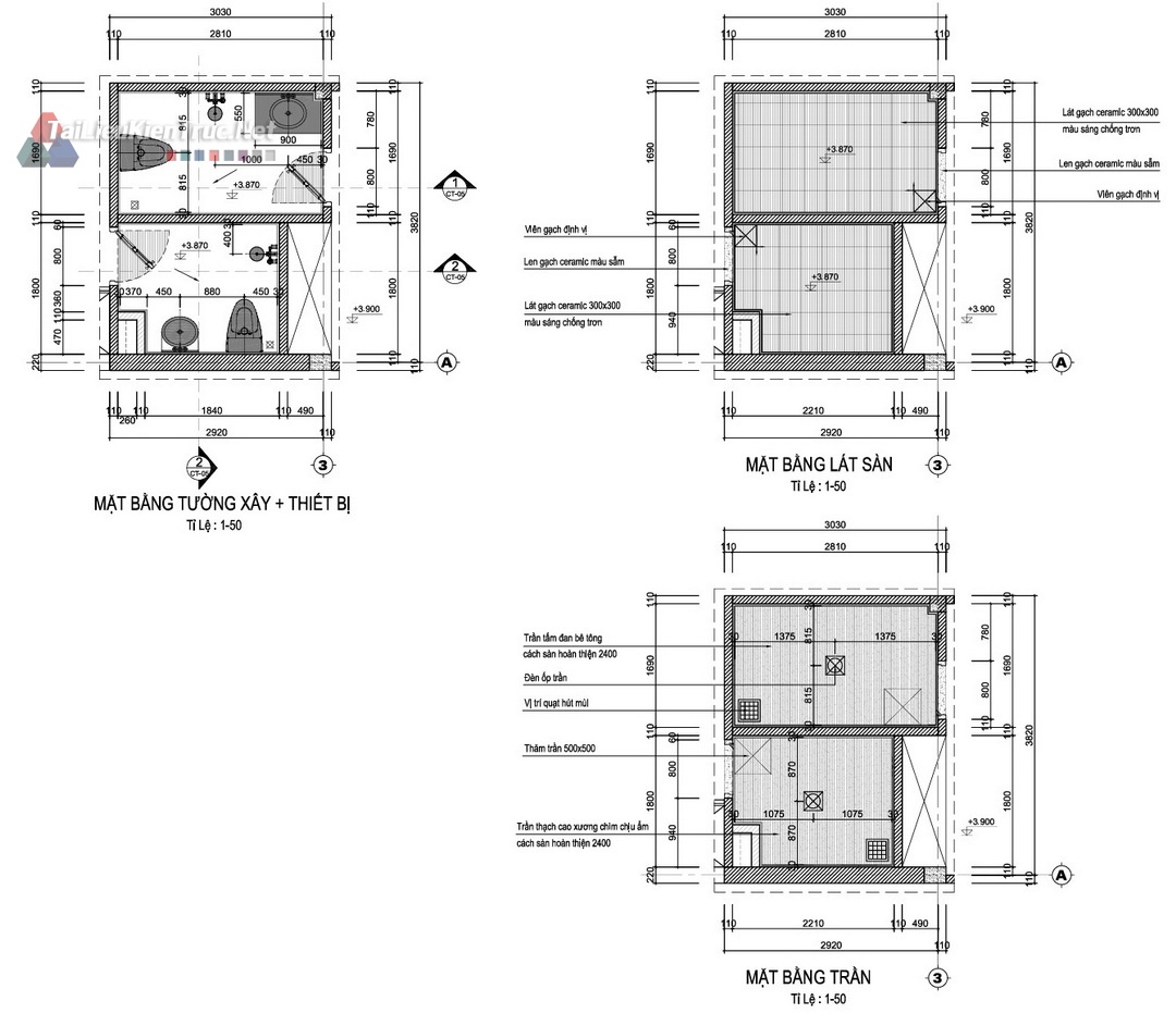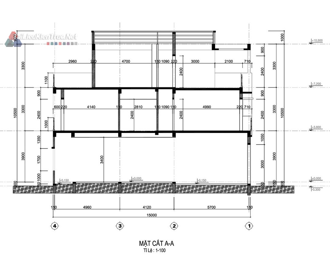 • Mặt bằng: Chi tiết mặt bằng kiến trúc Tầng 1, Tầng 2, Tầng TumMặt bằng Mái.