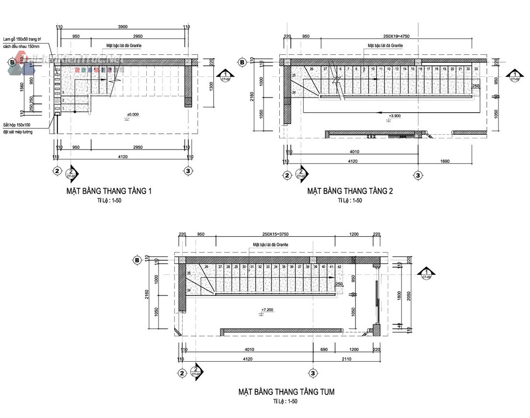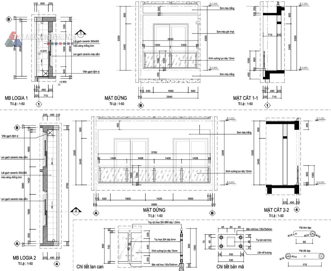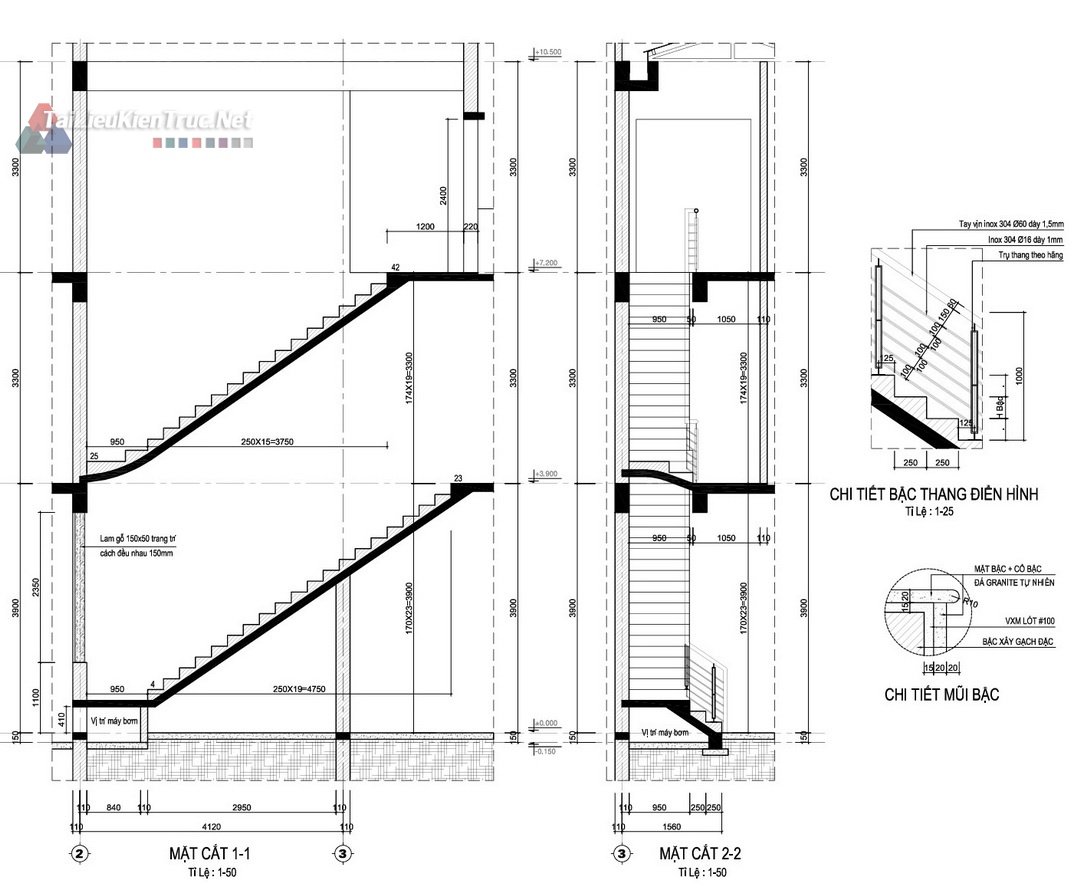 • Chi tiết: Bao gồm Chi tiết cầu thang (Mặt bằng, Mặt cắt 1-1, 2-2) và các chi tiết kỹ thuật khác.