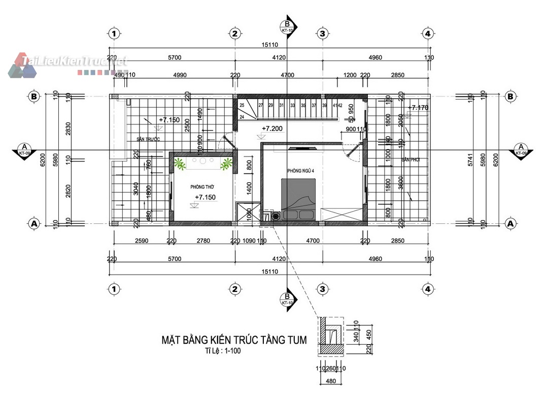 • Tầng Tum (Cos +7.200): 01 Phòng Ngủ (PHÒNG NGỦ 4), Phòng Thờ (PHÒNG THỜ), và khu vực Sân Thượng (SÂN THƯỢNG/SÂN PHƠI).