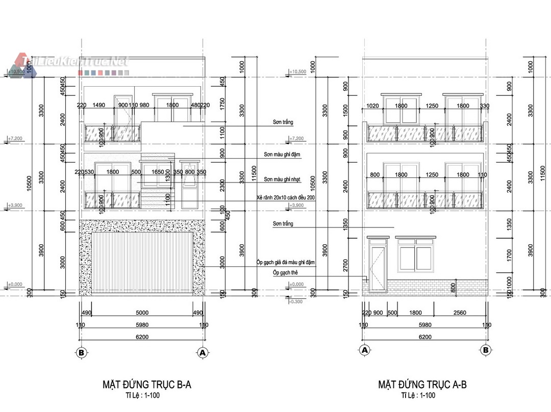 • Mặt đứng: Thể hiện rõ chi tiết hình khối và vật liệu ngoại thất qua các bản vẽ Mặt đứng trục A-B và B-A.