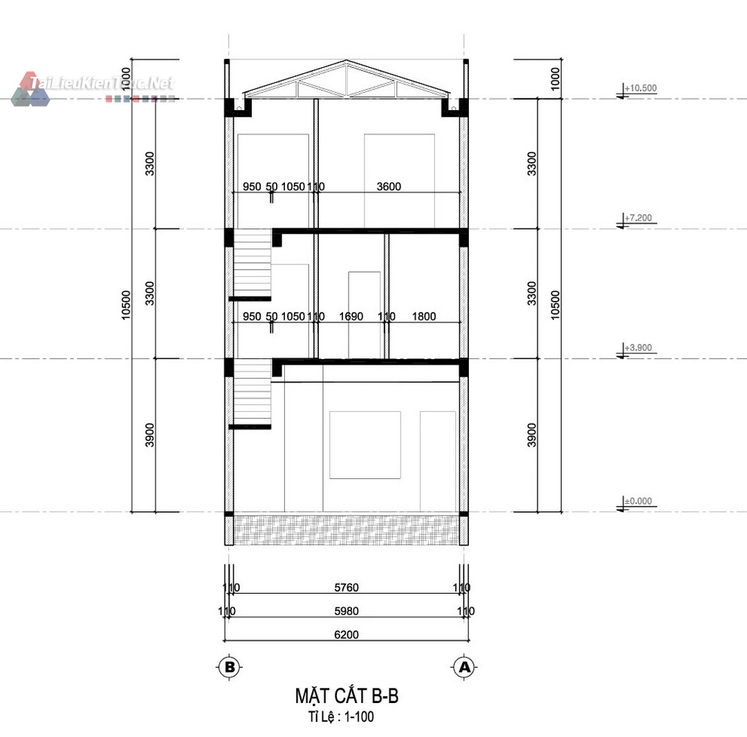 • Mặt cắt: Cung cấp thông tin về cao độ, chiều cao tầng, kết cấu sàn, và vị trí cầu thang qua các bản vẽ Mặt cắt A-A và B-B.
