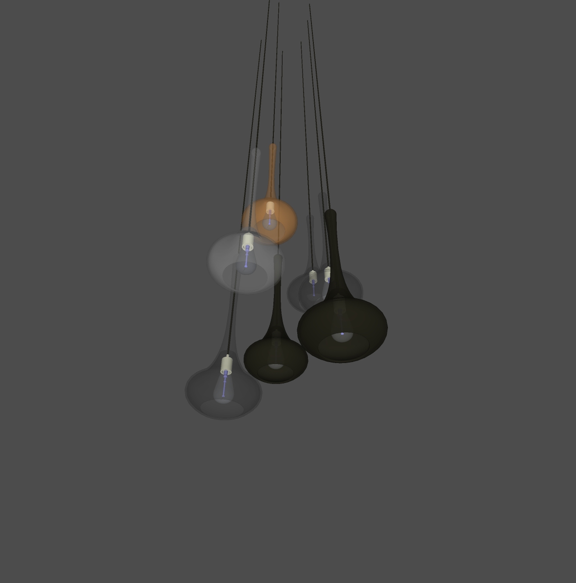 Những hình ảnh này mô tả chi tiết một mẫu đèn treo với thiết kế tinh tế và hiện đại. Bộ đèn gồm nhiêu phần tử được treo bằng dây, các bóng đèn có hình dáng tương tự như giọt nước được làm từ chất liệu thủy tinh trong suốt và gia công tỉ mỉ, mang lại hiệu ứng ánh sáng lung linh, dịu nhẹ khi được bật lên.