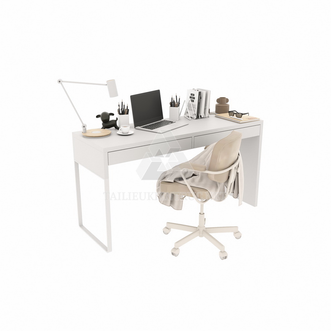 Hình ảnh hiển thị một bộ bàn làm việc với thiết kế đơn giản và sang trọng, bao gồm một chiếc bàn trắng hiện đại và một ghế xoay tiện dụng. Trên bàn, sắp xếp gọn gàng các vật dụng văn phòng thường ngày như laptop, đèn bàn, các cây bút trong giá đỡ và vài quyển sách. Bên cạnh đó, có thêm một tách cà phê và một số vật dụng trang trí nhỏ, tạo cảm giác thân thiện và hữu ích.