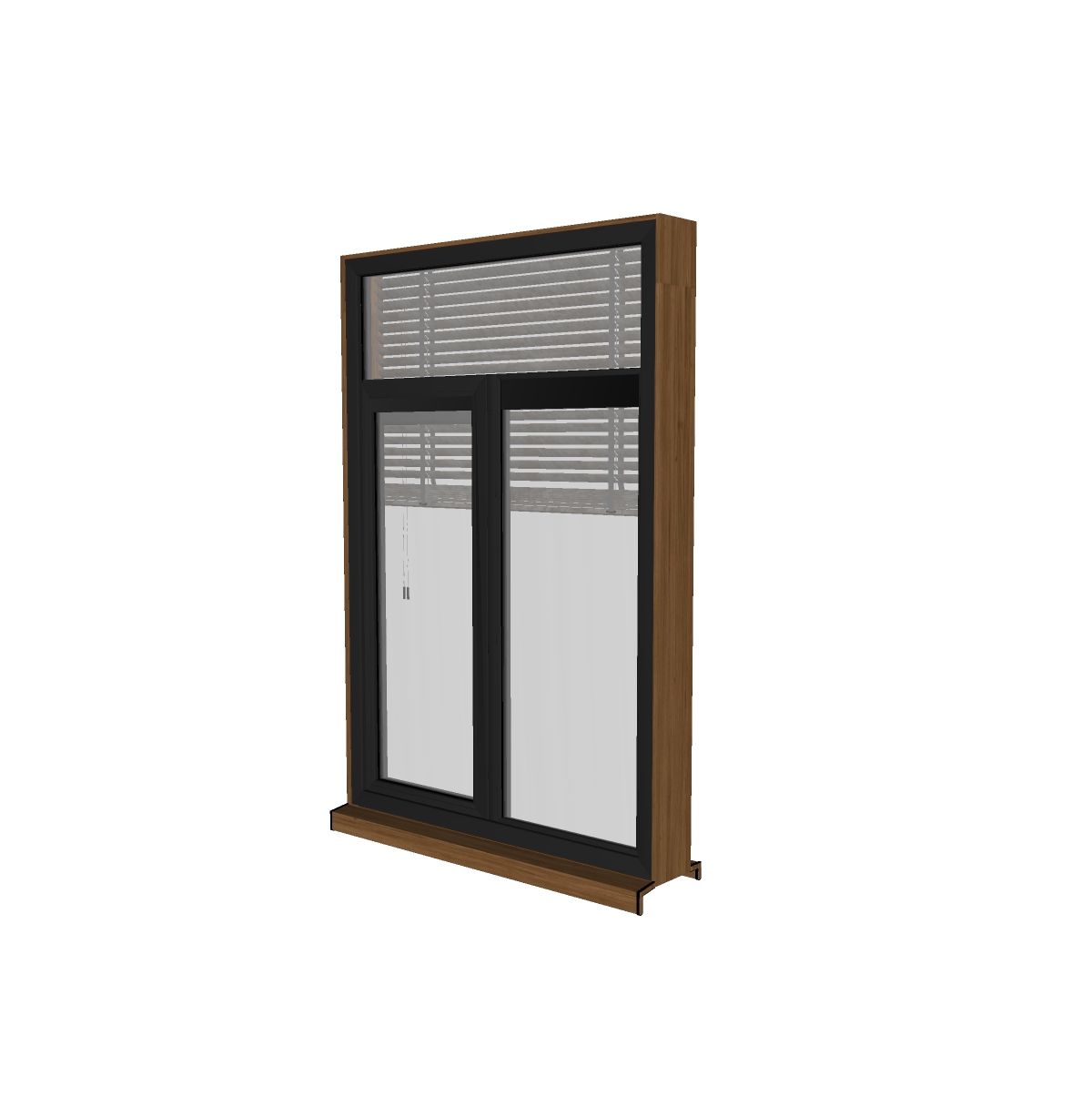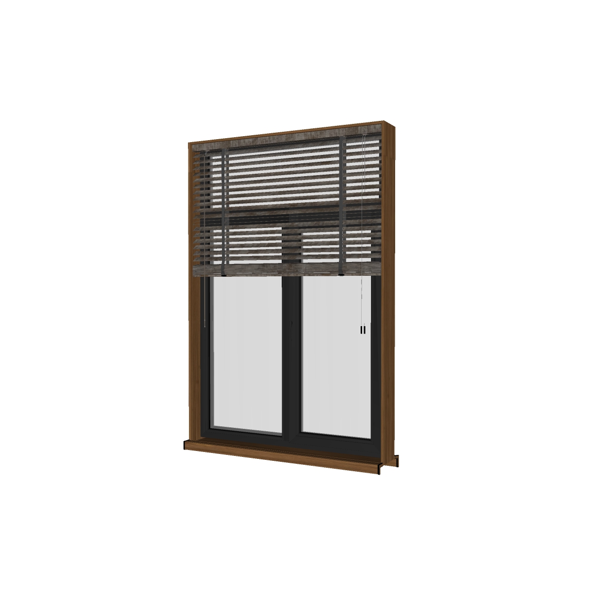 Cửa sổ trượt trong hình được thiết kế với đường nét tinh xảo và chất liệu cao cấp. Khung cửa sổ có màu đen mờ mạnh mẽ, kết hợp với viền vân gỗ sang trọng, tạo sự hài hòa giữa hiện đại và tự nhiên. Phía trên cửa sổ là hệ thống rèm ngang điều chỉnh, mang đến sự linh hoạt trong việc điều tiết ánh sáng.