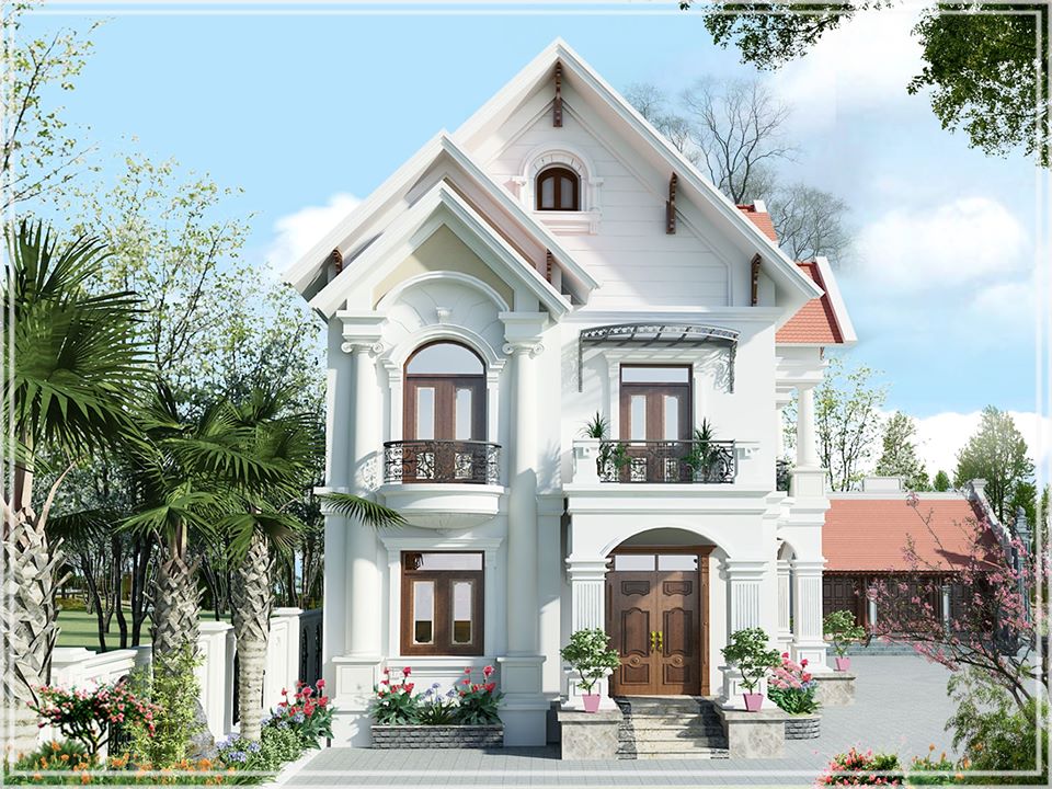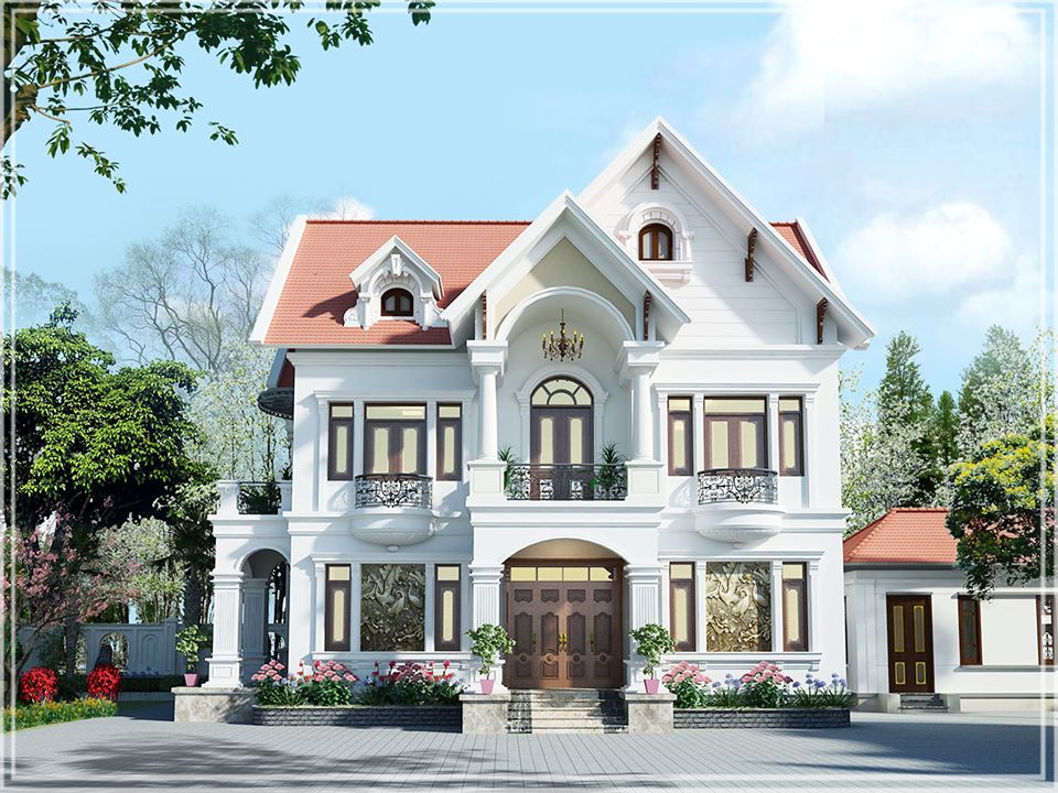 Hình ảnh minh họa một mẫu biệt thự hai tầng với thiết kế mái dốc đỏ nổi bật trên nền trời trong xanh, kết hợp cùng màu sơn tường trắng tạo nên sự tương phản thu hút. Ngôi nhà được bao quanh bởi khu vườn xanh mát với nhiều loại cây cảnh và hoa, tạo nên không gian thư giãn và gần gũi với thiên nhiên.