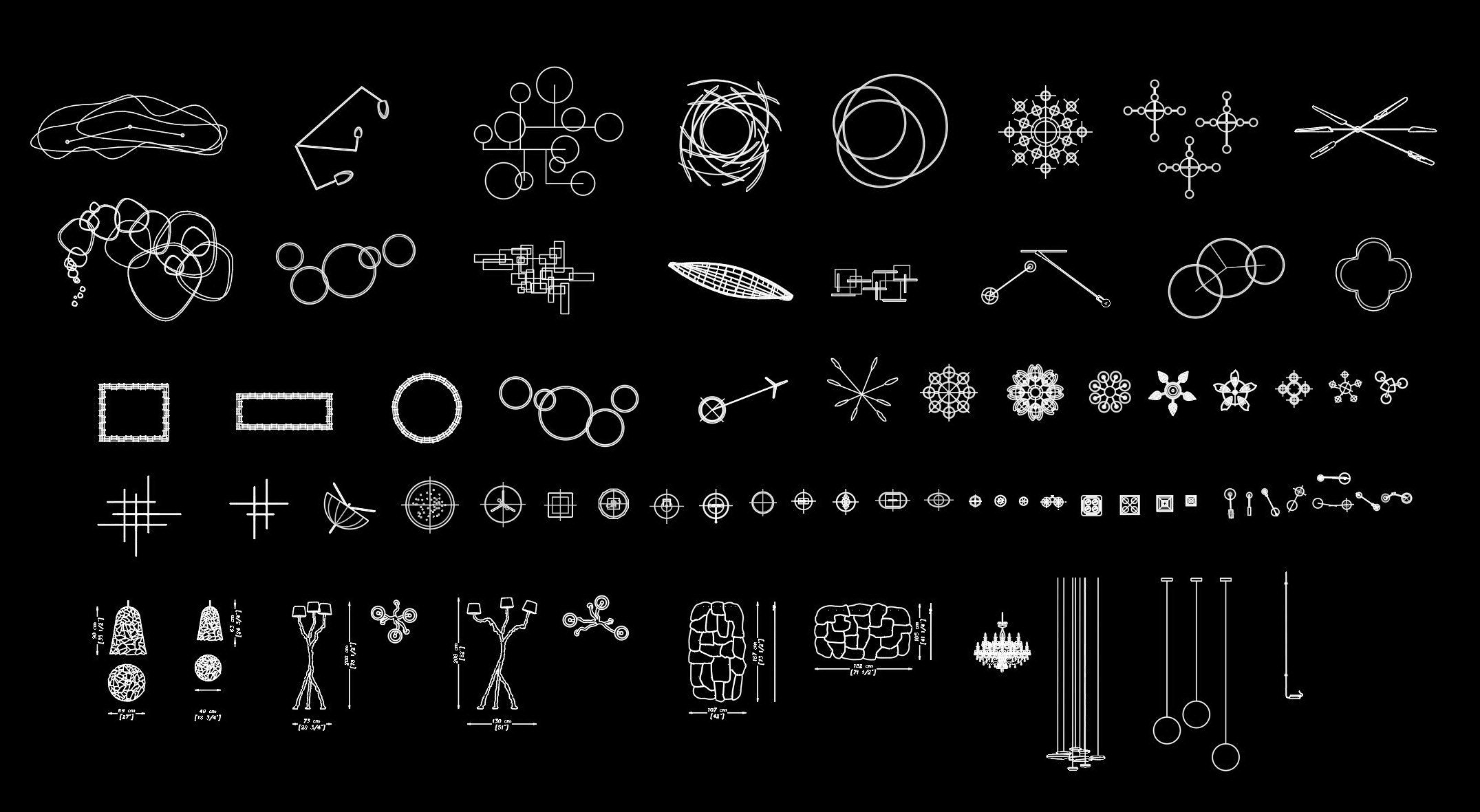 Các hình ảnh trong tài liệu thể hiện nhiều mẫu thiết kế hình học độc đáo. Chúng bao gồm từ các cấu trúc đối xứng như hình tròn, hình chữ nhật, đến các mô hình phức tạp hơn với các đường cong và điểm giao nhau phong phú. Những thiết kế này không chỉ phục vụ cho mục đích mỹ thuật mà còn có thể ứng dụng thực tế trong việc kết hợp và tạo hình kiến trúc.