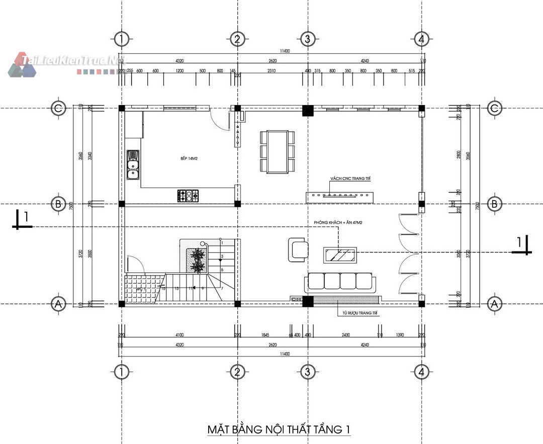 Tầng 1: Khu vực sinh hoạt chung (Phòng Khách 47m2), Bếp & Ăn (14m2), Sảnh thang.