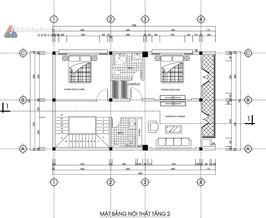 Tầng 2: 02 Phòng ngủ master rộng rãi (12.8m2 và 17m2) kèm WC khép kín/chung, khu vực tủ quần áo và logia/ban công.